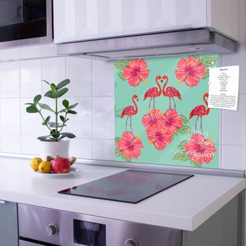 Die banjado Glas Küchenrückwand in verschiedenen Größen mit Motiv Flamingo Liebe schützt Ihre Küchenfliesen vor Fettspritzern oder Wasserflecken. Der Spritzschutz ist gleichzeitig magnetisch und hält Ihre Rezepte oder Einkaufslisten. 4 Neodym-Magnete und 1 Kreidestift liegen bereits bei. Leuchtende Motive und hochwertiges Material machen den Spritzschutz zum Designobjekt. Das dekorative Glasbild gibt Ihrer Küche ein individuelles Erscheinungsbild. Abgerundete Kanten und Sicherheitsglas sorgen für einen sicheren Einsatz.