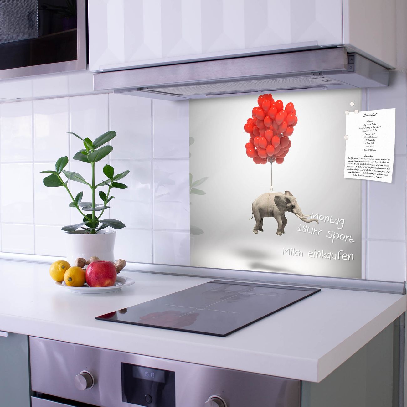 Die banjado Glas Küchenrückwand in verschiedenen Größen mit Motiv Fliegender Elefant schützt Ihre Küchenfliesen vor Fettspritzern oder Wasserflecken. Der Spritzschutz ist gleichzeitig magnetisch und hält Ihre Rezepte oder Einkaufslisten. 4 Neodym-Magnete und 1 Kreidestift liegen bereits bei. Leuchtende Motive und hochwertiges Material machen den Spritzschutz zum Designobjekt. Das dekorative Glasbild gibt Ihrer Küche ein individuelles Erscheinungsbild. Abgerundete Kanten und Sicherheitsglas sorgen für einen sicheren Einsatz.