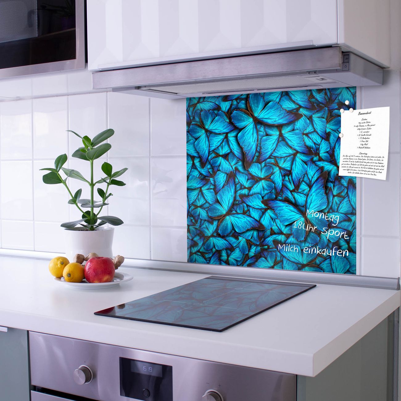 Die Küchenrückwand ist eine elegante Mehrzwecktafel: als Spritzschutz hinter Herd oder Waschbecken, hält Notizen wie ein Memoboard, ist beschreibbar mit Kreidestiften oder Whiteboard-Markern, sieht umwerfend als Glasbild aus. Sie besteht aus gehärtetem Glas, die Rückwand aus einem magnetischen Stahlblech. Durch die superflache Bauweise haben Sie die Wahl aus einer Vielzahl von Befestigungsmöglichkeiten. Sie können die Küchenrückwand mit einem Montagekleber superflach an die Wand kleben oder Sie wählen eines unserer passenden Befestigungssets, welches eine optimale Montage garantiert. Die Küchenrückwand besteht aus zertifiziertem Sicherheitsglas. Durch die mitgelieferten 4 Neodym-Magnete ist Ihre Glas Magnettafel sofort einsatzbereit.