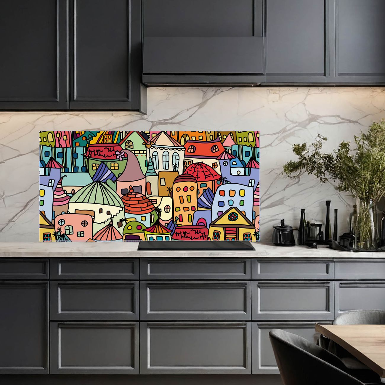 Die banjado Glas Küchenrückwand in verschiedenen Größen mit Motiv Funky Town schützt Ihre Küchenfliesen vor Fettspritzern oder Wasserflecken. Der Spritzschutz ist gleichzeitig magnetisch und hält Ihre Rezepte oder Einkaufslisten. 4 Neodym-Magnete und 1 Kreidestift liegen bereits bei. Leuchtende Motive und hochwertiges Material machen den Spritzschutz zum Designobjekt. Das dekorative Glasbild gibt Ihrer Küche ein individuelles Erscheinungsbild. Abgerundete Kanten und Sicherheitsglas sorgen für einen sicheren Einsatz.