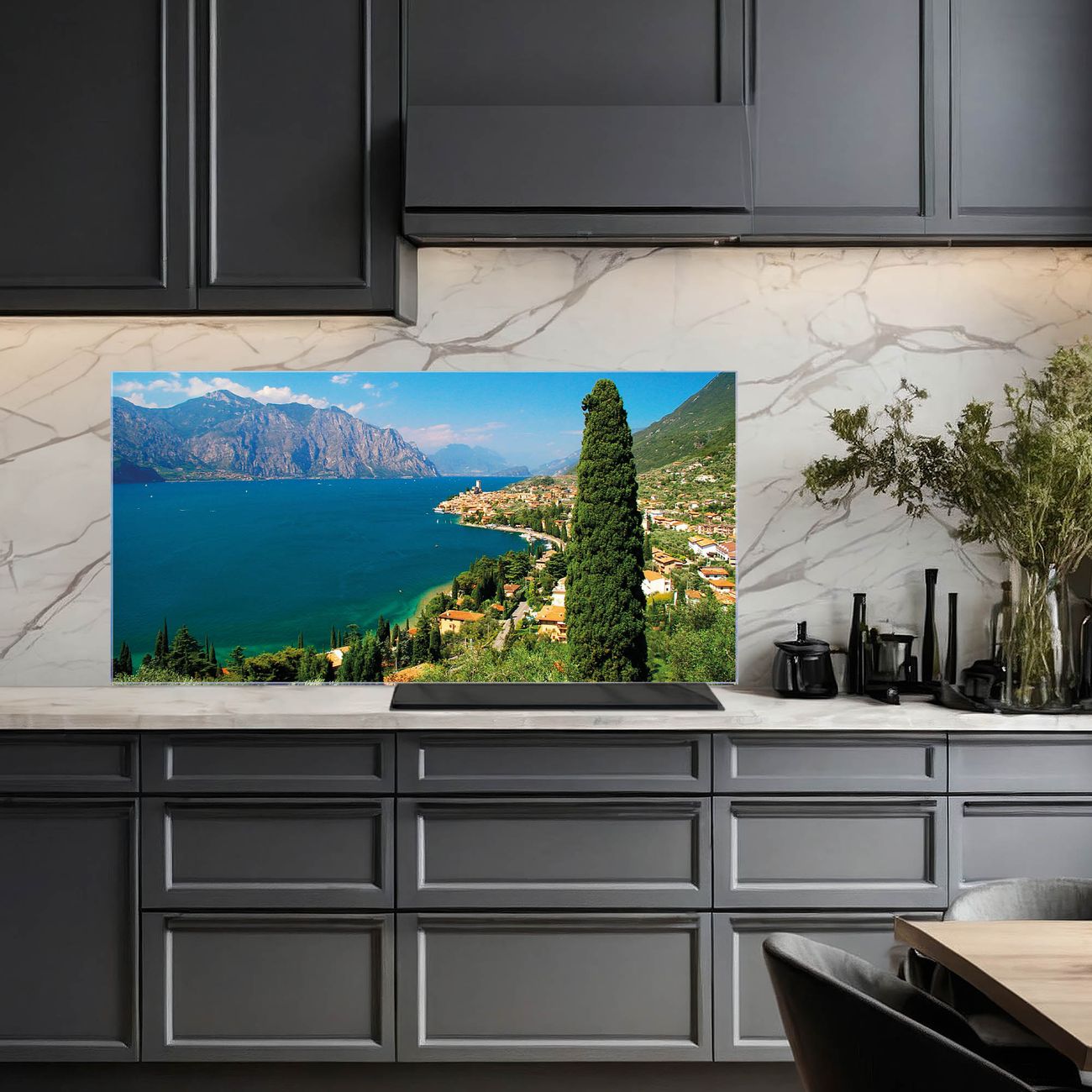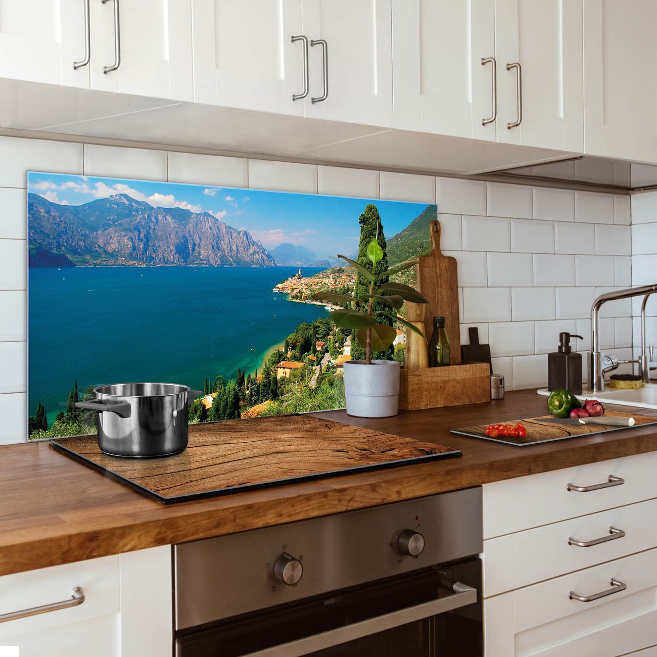 Die banjado Glas Küchenrückwand in verschiedenen Größen mit Motiv Gardasee schützt Ihre Küchenfliesen vor Fettspritzern oder Wasserflecken. Der Spritzschutz ist gleichzeitig magnetisch und hält Ihre Rezepte oder Einkaufslisten. 4 Neodym-Magnete und 1 Kreidestift liegen bereits bei. Leuchtende Motive und hochwertiges Material machen den Spritzschutz zum Designobjekt. Das dekorative Glasbild gibt Ihrer Küche ein individuelles Erscheinungsbild. Abgerundete Kanten und Sicherheitsglas sorgen für einen sicheren Einsatz.
