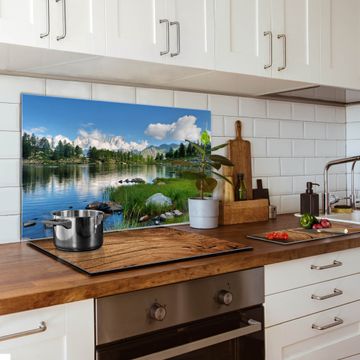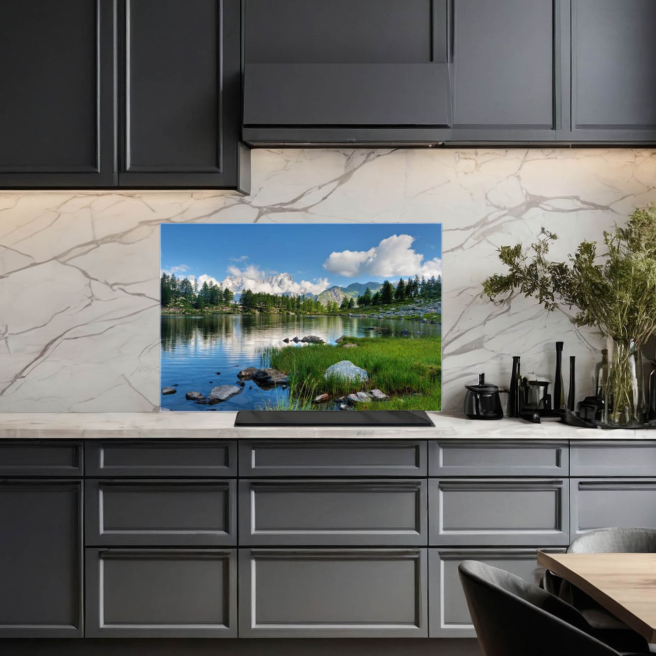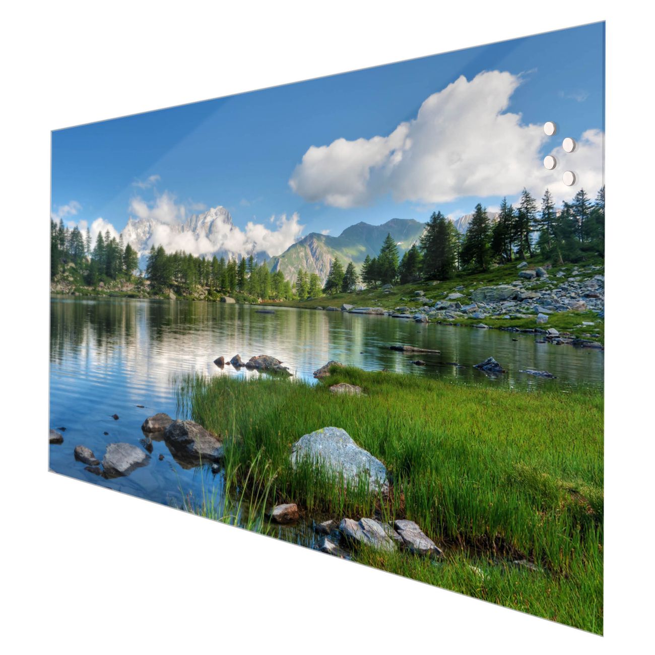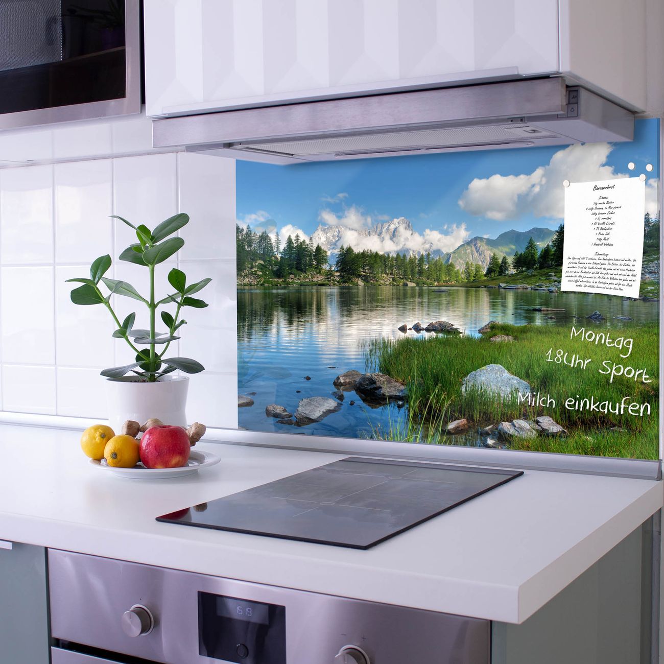 Die banjado Glas Küchenrückwand in verschiedenen Größen mit Motiv Gebirgssee schützt Ihre Küchenfliesen vor Fettspritzern oder Wasserflecken. Der Spritzschutz ist gleichzeitig magnetisch und hält Ihre Rezepte oder Einkaufslisten. 4 Neodym-Magnete und 1 Kreidestift liegen bereits bei. Leuchtende Motive und hochwertiges Material machen den Spritzschutz zum Designobjekt. Das dekorative Glasbild gibt Ihrer Küche ein individuelles Erscheinungsbild. Abgerundete Kanten und Sicherheitsglas sorgen für einen sicheren Einsatz.