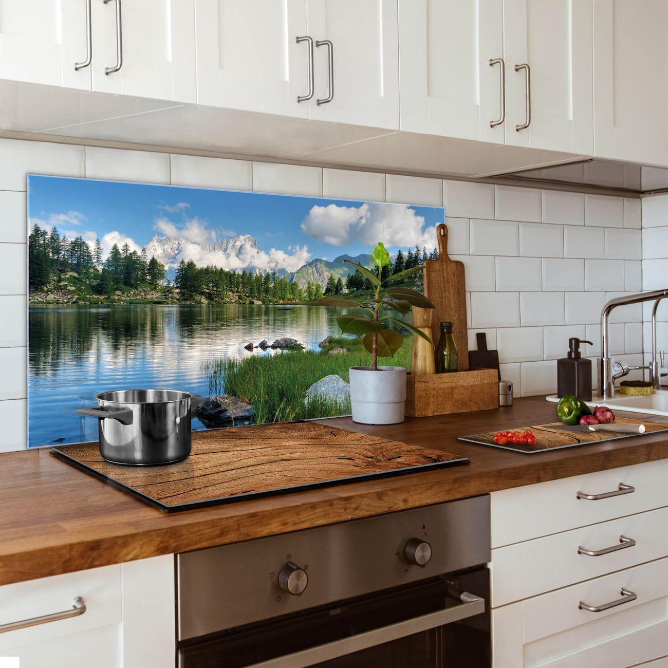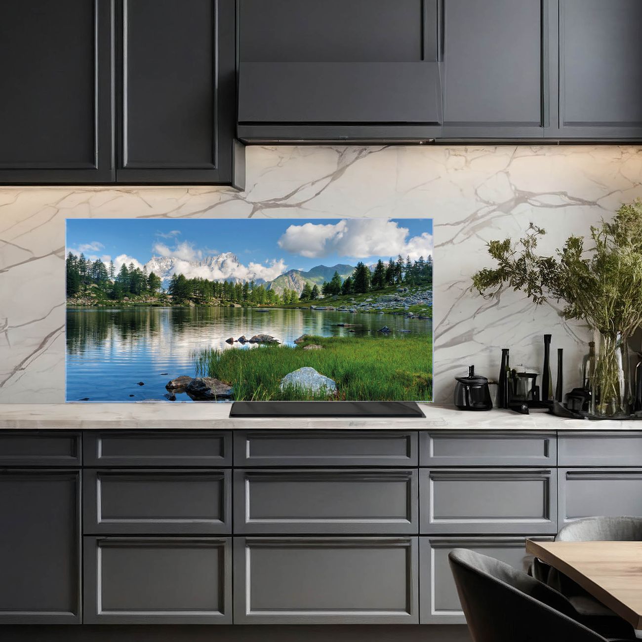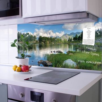 Die banjado Glas Küchenrückwand in verschiedenen Größen mit Motiv Gebirgssee schützt Ihre Küchenfliesen vor Fettspritzern oder Wasserflecken. Der Spritzschutz ist gleichzeitig magnetisch und hält Ihre Rezepte oder Einkaufslisten. 4 Neodym-Magnete und 1 Kreidestift liegen bereits bei. Leuchtende Motive und hochwertiges Material machen den Spritzschutz zum Designobjekt. Das dekorative Glasbild gibt Ihrer Küche ein individuelles Erscheinungsbild. Abgerundete Kanten und Sicherheitsglas sorgen für einen sicheren Einsatz.