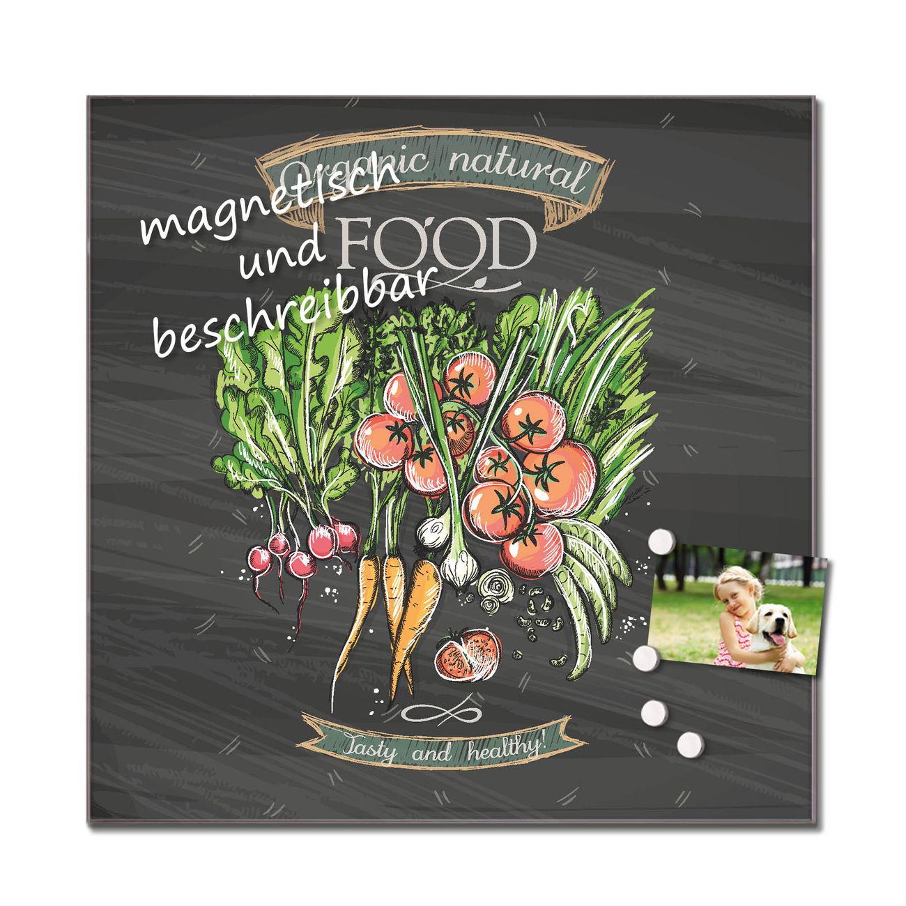 Die banjado Glas Küchenrückwand in verschiedenen Größen mit Motiv Gesund Und Lecker schützt Ihre Küchenfliesen vor Fettspritzern oder Wasserflecken. Der Spritzschutz ist gleichzeitig magnetisch und hält Ihre Rezepte oder Einkaufslisten. 4 Neodym-Magnete und 1 Kreidestift liegen bereits bei. Leuchtende Motive und hochwertiges Material machen den Spritzschutz zum Designobjekt. Das dekorative Glasbild gibt Ihrer Küche ein individuelles Erscheinungsbild. Abgerundete Kanten und Sicherheitsglas sorgen für einen sicheren Einsatz.