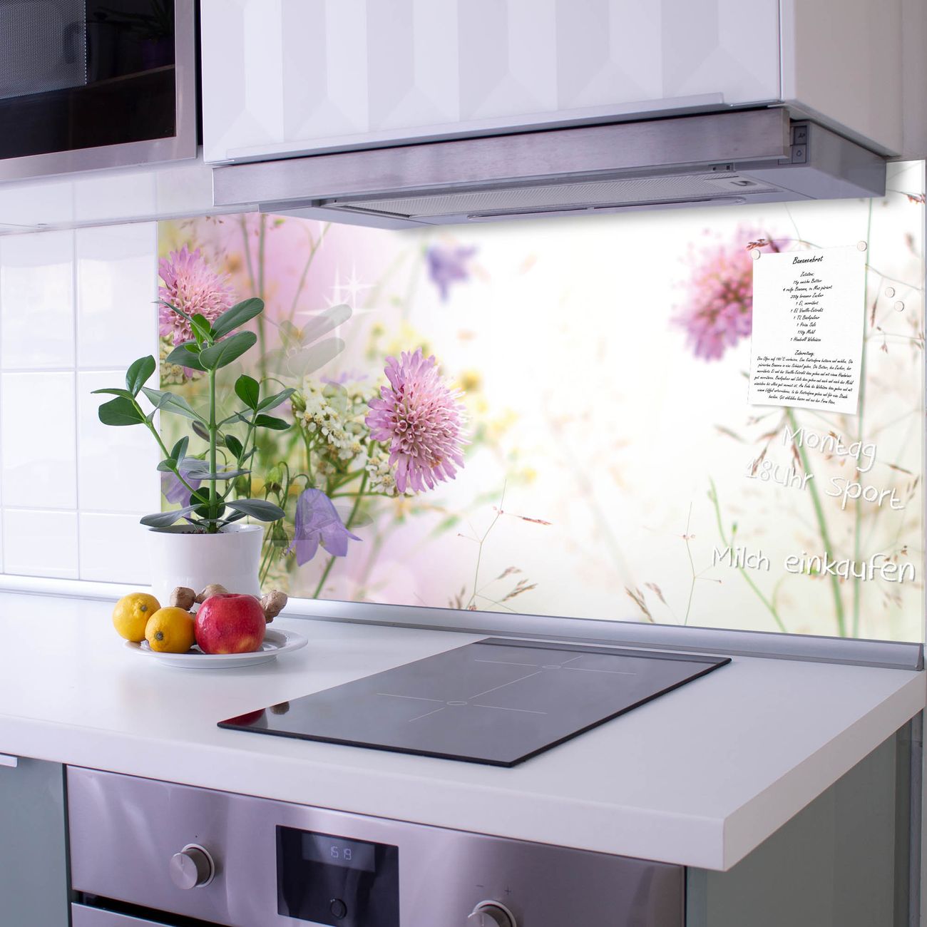 Die Küchenrückwand ist eine elegante Mehrzwecktafel: als Spritzschutz hinter Herd oder Waschbecken, hält Notizen wie ein Memoboard, ist beschreibbar mit Kreidestiften oder Whiteboard-Markern, sieht umwerfend als Glasbild aus. Sie besteht aus gehärtetem Glas, die Rückwand aus einem magnetischen Stahlblech. Durch die superflache Bauweise haben Sie die Wahl aus einer Vielzahl von Befestigungsmöglichkeiten. Sie können die Küchenrückwand mit einem Montagekleber superflach an die Wand kleben oder Sie wählen eines unserer passenden Befestigungssets, welches eine optimale Montage garantiert. Die Küchenrückwand besteht aus zertifiziertem Sicherheitsglas. Durch die mitgelieferten 4 Neodym-Magnete ist Ihre Glas Magnettafel sofort einsatzbereit.
