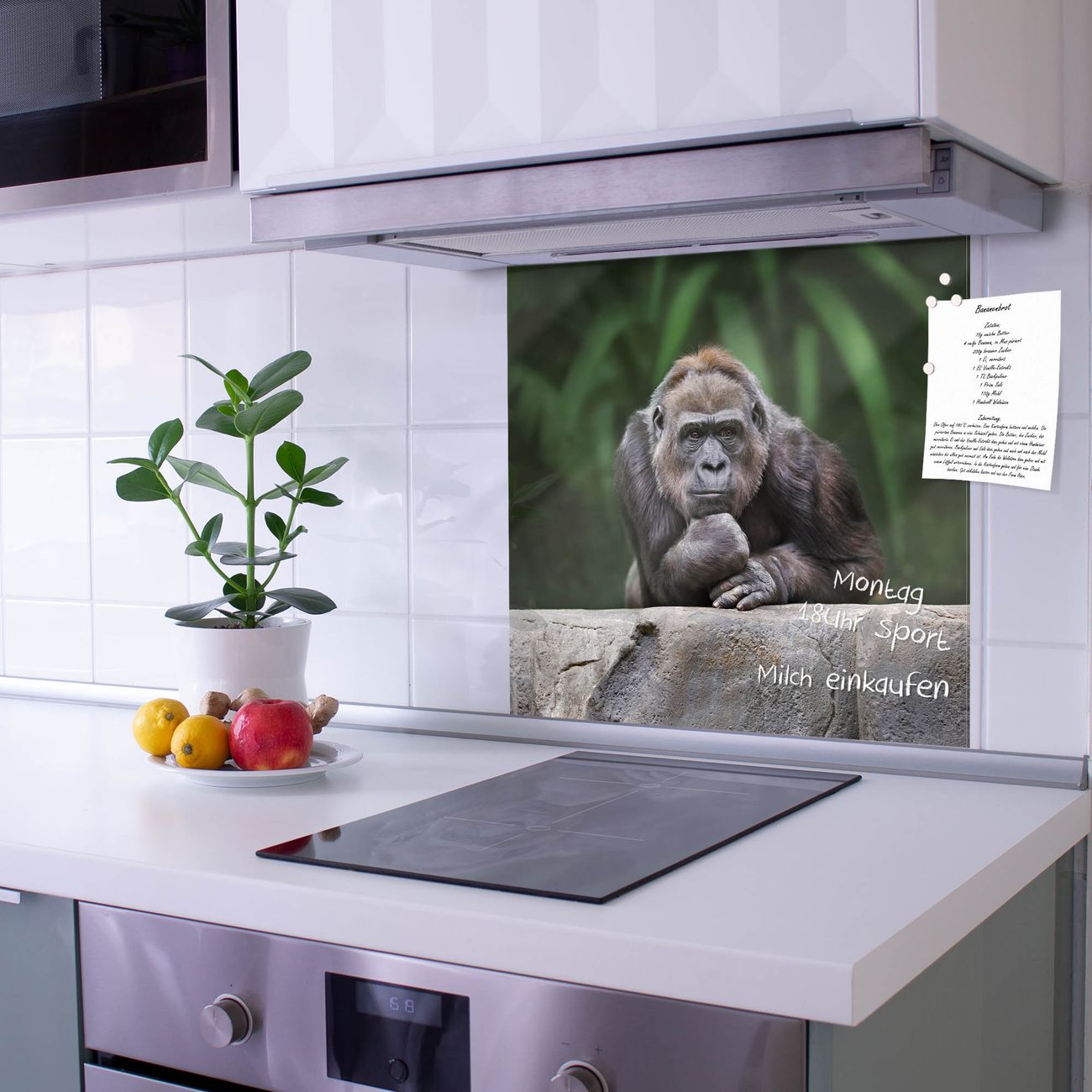 Die banjado Glas Küchenrückwand in verschiedenen Größen mit Motiv Gorilla schützt Ihre Küchenfliesen vor Fettspritzern oder Wasserflecken. Der Spritzschutz ist gleichzeitig magnetisch und hält Ihre Rezepte oder Einkaufslisten. 4 Neodym-Magnete und 1 Kreidestift liegen bereits bei. Leuchtende Motive und hochwertiges Material machen den Spritzschutz zum Designobjekt. Das dekorative Glasbild gibt Ihrer Küche ein individuelles Erscheinungsbild. Abgerundete Kanten und Sicherheitsglas sorgen für einen sicheren Einsatz.