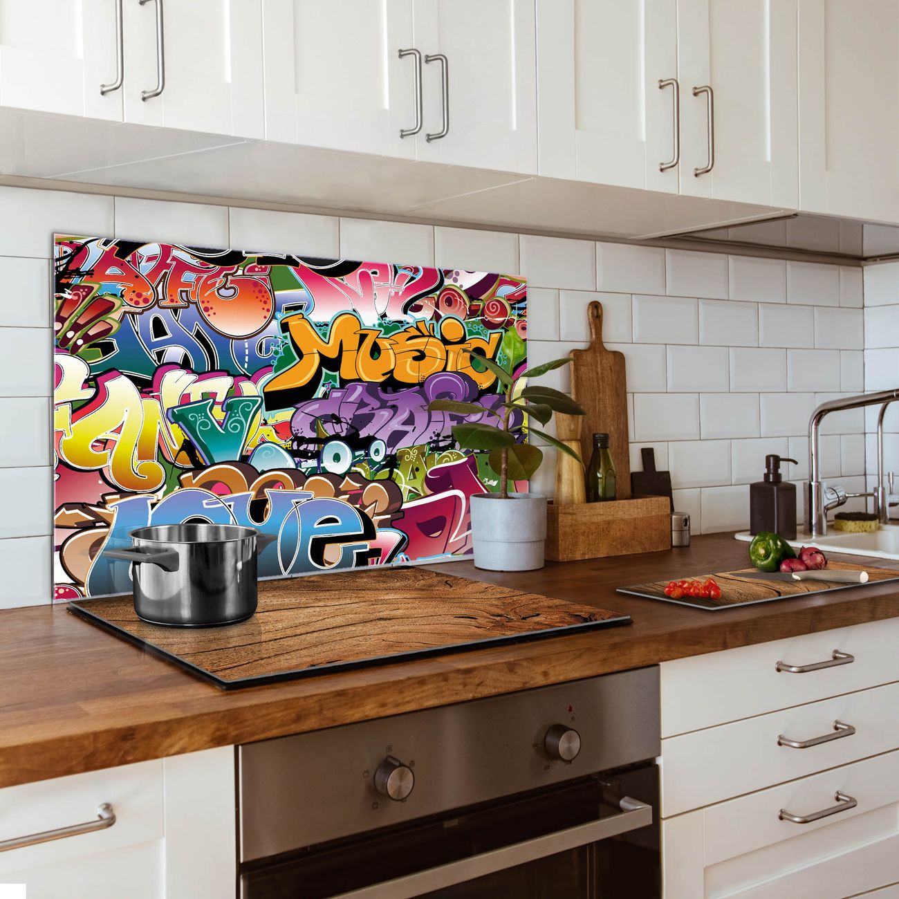 Die banjado Glas Küchenrückwand in verschiedenen Größen mit Motiv Graffiti schützt Ihre Küchenfliesen vor Fettspritzern oder Wasserflecken. Der Spritzschutz ist gleichzeitig magnetisch und hält Ihre Rezepte oder Einkaufslisten. 4 Neodym-Magnete und 1 Kreidestift liegen bereits bei. Leuchtende Motive und hochwertiges Material machen den Spritzschutz zum Designobjekt. Das dekorative Glasbild gibt Ihrer Küche ein individuelles Erscheinungsbild. Abgerundete Kanten und Sicherheitsglas sorgen für einen sicheren Einsatz.