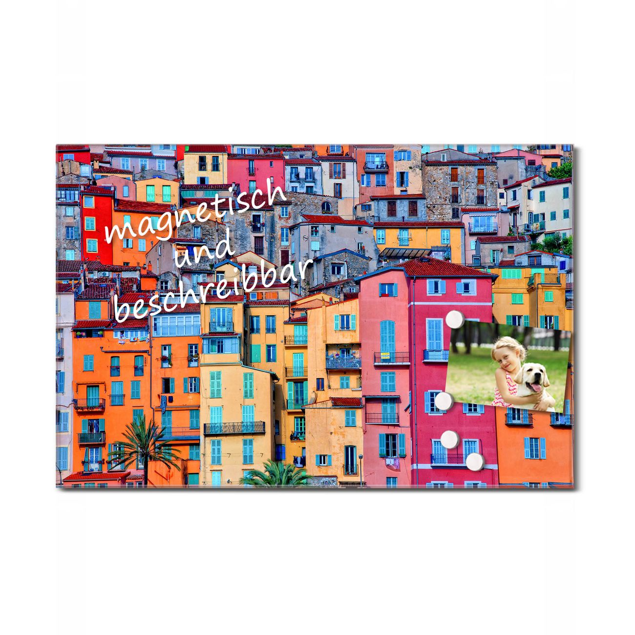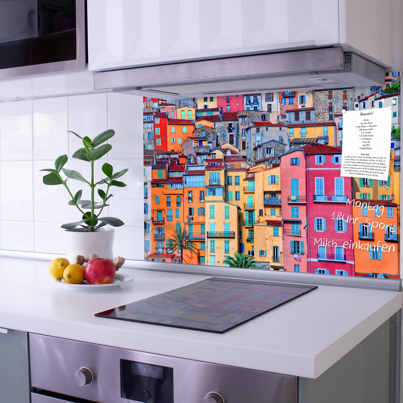 Die Küchenrückwand ist eine elegante Mehrzwecktafel: als Spritzschutz hinter Herd oder Waschbecken, hält Notizen wie ein Memoboard, ist beschreibbar mit Kreidestiften oder Whiteboard-Markern, sieht umwerfend als Glasbild aus. Sie besteht aus gehärtetem Glas, die Rückwand aus einem magnetischen Stahlblech. Durch die superflache Bauweise haben Sie die Wahl aus einer Vielzahl von Befestigungsmöglichkeiten. Sie können die Küchenrückwand mit einem Montagekleber superflach an die Wand kleben oder Sie wählen eines unserer passenden Befestigungssets, welches eine optimale Montage garantiert. Die Küchenrückwand besteht aus zertifiziertem Sicherheitsglas. Durch die mitgelieferten 4 Neodym-Magnete ist Ihre Glas Magnettafel sofort einsatzbereit.