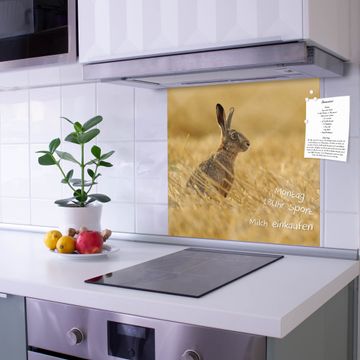 Die banjado Glas Küchenrückwand in verschiedenen Größen mit Motiv Hase schützt Ihre Küchenfliesen vor Fettspritzern oder Wasserflecken. Der Spritzschutz ist gleichzeitig magnetisch und hält Ihre Rezepte oder Einkaufslisten. 4 Neodym-Magnete und 1 Kreidestift liegen bereits bei. Leuchtende Motive und hochwertiges Material machen den Spritzschutz zum Designobjekt. Das dekorative Glasbild gibt Ihrer Küche ein individuelles Erscheinungsbild. Abgerundete Kanten und Sicherheitsglas sorgen für einen sicheren Einsatz.