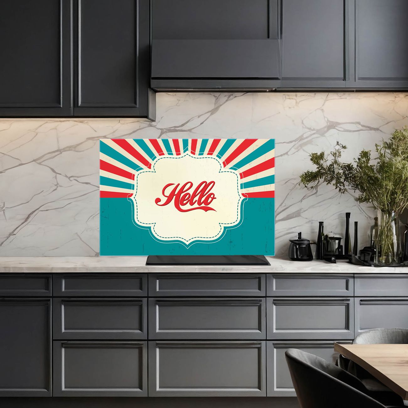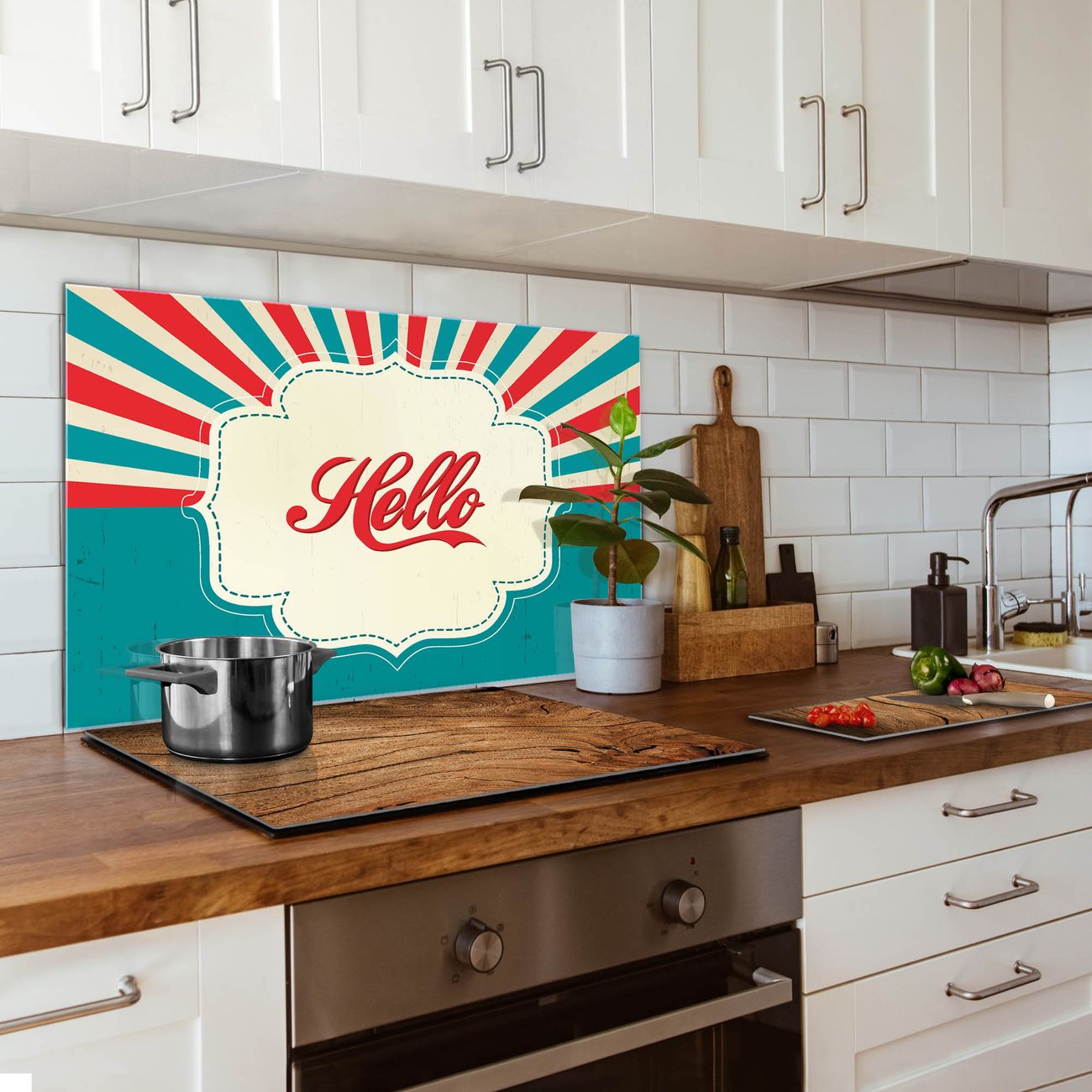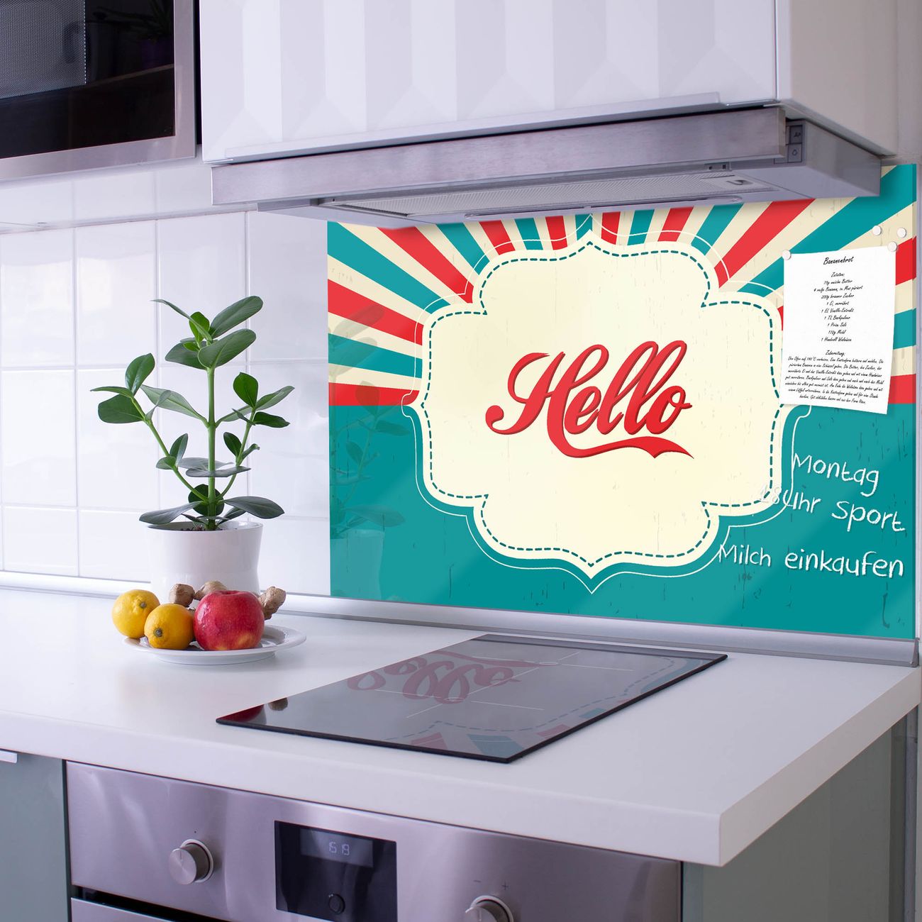 Die banjado Glas Küchenrückwand in verschiedenen Größen mit Motiv Hello schützt Ihre Küchenfliesen vor Fettspritzern oder Wasserflecken. Der Spritzschutz ist gleichzeitig magnetisch und hält Ihre Rezepte oder Einkaufslisten. 4 Neodym-Magnete und 1 Kreidestift liegen bereits bei. Leuchtende Motive und hochwertiges Material machen den Spritzschutz zum Designobjekt. Das dekorative Glasbild gibt Ihrer Küche ein individuelles Erscheinungsbild. Abgerundete Kanten und Sicherheitsglas sorgen für einen sicheren Einsatz.