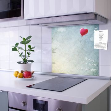 Die banjado Glas Küchenrückwand in verschiedenen Größen mit Motiv Herzballon schützt Ihre Küchenfliesen vor Fettspritzern oder Wasserflecken. Der Spritzschutz ist gleichzeitig magnetisch und hält Ihre Rezepte oder Einkaufslisten. 4 Neodym-Magnete und 1 Kreidestift liegen bereits bei. Leuchtende Motive und hochwertiges Material machen den Spritzschutz zum Designobjekt. Das dekorative Glasbild gibt Ihrer Küche ein individuelles Erscheinungsbild. Abgerundete Kanten und Sicherheitsglas sorgen für einen sicheren Einsatz.