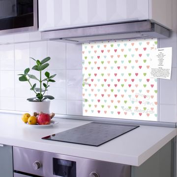 Die banjado Glas Küchenrückwand in verschiedenen Größen mit Motiv Herzen Auf Weiß schützt Ihre Küchenfliesen vor Fettspritzern oder Wasserflecken. Der Spritzschutz ist gleichzeitig magnetisch und hält Ihre Rezepte oder Einkaufslisten. 4 Neodym-Magnete und 1 Kreidestift liegen bereits bei. Leuchtende Motive und hochwertiges Material machen den Spritzschutz zum Designobjekt. Das dekorative Glasbild gibt Ihrer Küche ein individuelles Erscheinungsbild. Abgerundete Kanten und Sicherheitsglas sorgen für einen sicheren Einsatz.