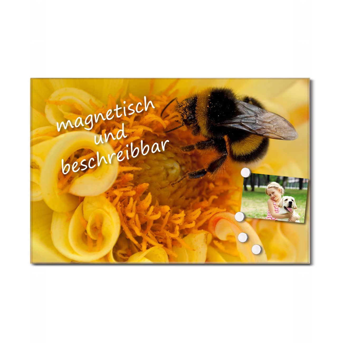 Die banjado Glas Küchenrückwand in verschiedenen Größen mit Motiv Hummel schützt Ihre Küchenfliesen vor Fettspritzern oder Wasserflecken. Der Spritzschutz ist gleichzeitig magnetisch und hält Ihre Rezepte oder Einkaufslisten. 4 Neodym-Magnete und 1 Kreidestift liegen bereits bei. Leuchtende Motive und hochwertiges Material machen den Spritzschutz zum Designobjekt. Das dekorative Glasbild gibt Ihrer Küche ein individuelles Erscheinungsbild. Abgerundete Kanten und Sicherheitsglas sorgen für einen sicheren Einsatz.