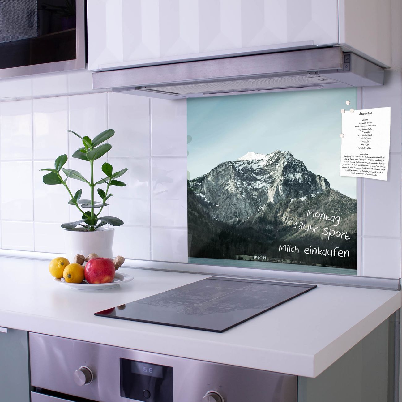 Die banjado Glas Küchenrückwand in verschiedenen Größen mit Motiv Im Schatten des Bergs schützt Ihre Küchenfliesen vor Fettspritzern oder Wasserflecken. Der Spritzschutz ist gleichzeitig magnetisch und hält Ihre Rezepte oder Einkaufslisten. 4 Neodym-Magnete und 1 Kreidestift liegen bereits bei. Leuchtende Motive und hochwertiges Material machen den Spritzschutz zum Designobjekt. Das dekorative Glasbild gibt Ihrer Küche ein individuelles Erscheinungsbild. Abgerundete Kanten und Sicherheitsglas sorgen für einen sicheren Einsatz.
