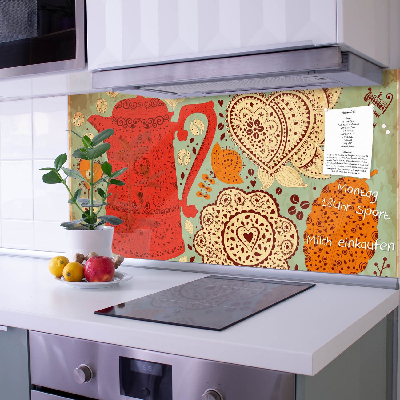 Die banjado Glas Küchenrückwand in verschiedenen Größen mit Motiv Indischer Kaffee schützt Ihre Küchenfliesen vor Fettspritzern oder Wasserflecken. Der Spritzschutz ist gleichzeitig magnetisch und hält Ihre Rezepte oder Einkaufslisten. 4 Neodym-Magnete und 1 Kreidestift liegen bereits bei. Leuchtende Motive und hochwertiges Material machen den Spritzschutz zum Designobjekt. Das dekorative Glasbild gibt Ihrer Küche ein individuelles Erscheinungsbild. Abgerundete Kanten und Sicherheitsglas sorgen für einen sicheren Einsatz.