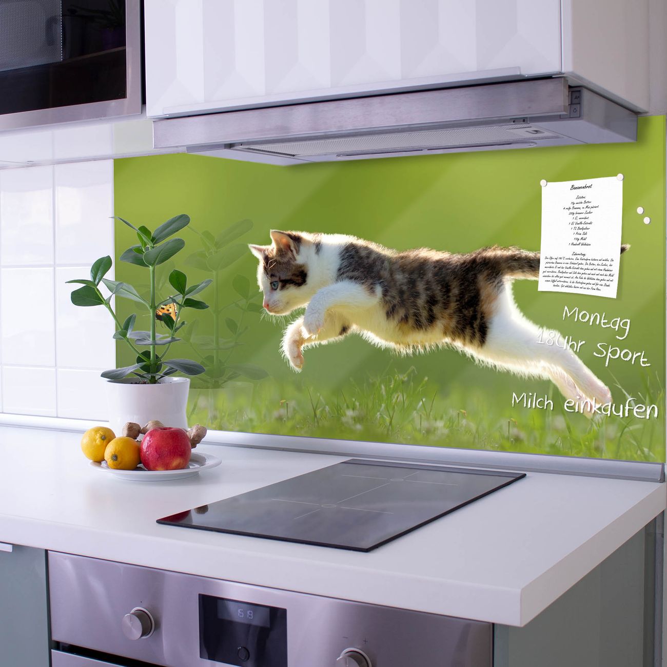 Die Küchenrückwand ist eine elegante Mehrzwecktafel: als Spritzschutz hinter Herd oder Waschbecken, hält Notizen wie ein Memoboard, ist beschreibbar mit Kreidestiften oder Whiteboard-Markern, sieht umwerfend als Glasbild aus. Sie besteht aus gehärtetem Glas, die Rückwand aus einem magnetischen Stahlblech. Durch die superflache Bauweise haben Sie die Wahl aus einer Vielzahl von Befestigungsmöglichkeiten. Sie können die Küchenrückwand mit einem Montagekleber superflach an die Wand kleben oder Sie wählen eines unserer passenden Befestigungssets, welches eine optimale Montage garantiert. Die Küchenrückwand besteht aus zertifiziertem Sicherheitsglas. Durch die mitgelieferten 4 Neodym-Magnete ist Ihre Glas Magnettafel sofort einsatzbereit.