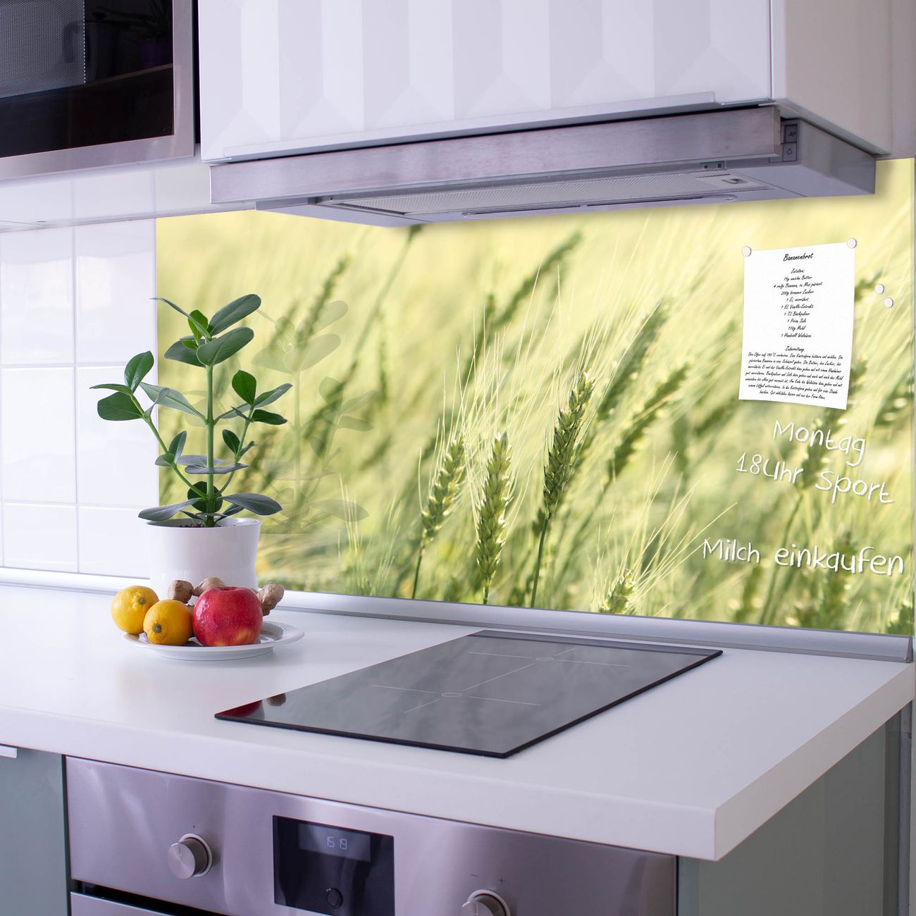 Die banjado Glas Küchenrückwand in verschiedenen Größen mit Motiv Junges Getreide schützt Ihre Küchenfliesen vor Fettspritzern oder Wasserflecken. Der Spritzschutz ist gleichzeitig magnetisch und hält Ihre Rezepte oder Einkaufslisten. 4 Neodym-Magnete und 1 Kreidestift liegen bereits bei. Leuchtende Motive und hochwertiges Material machen den Spritzschutz zum Designobjekt. Das dekorative Glasbild gibt Ihrer Küche ein individuelles Erscheinungsbild. Abgerundete Kanten und Sicherheitsglas sorgen für einen sicheren Einsatz.