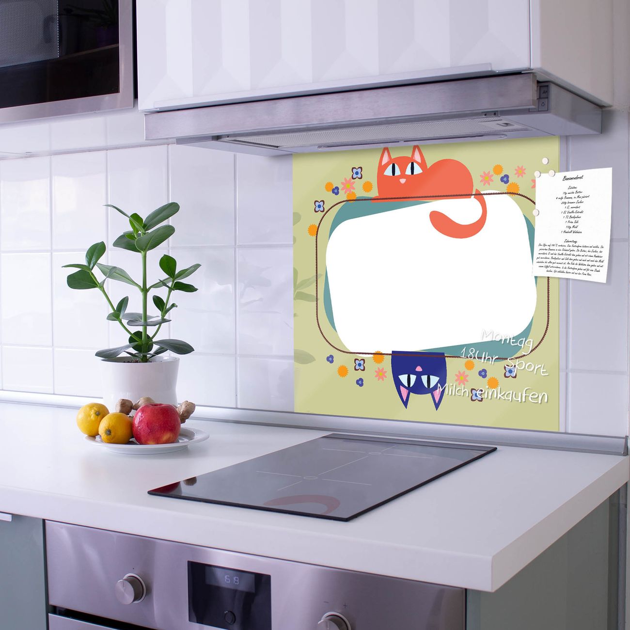 Die Küchenrückwand ist eine elegante Mehrzwecktafel: als Spritzschutz hinter Herd oder Waschbecken, hält Notizen wie ein Memoboard, ist beschreibbar mit Kreidestiften oder Whiteboard-Markern, sieht umwerfend als Glasbild aus. Sie besteht aus gehärtetem Glas, die Rückwand aus einem magnetischen Stahlblech. Durch die superflache Bauweise haben Sie die Wahl aus einer Vielzahl von Befestigungsmöglichkeiten. Sie können die Küchenrückwand mit einem Montagekleber superflach an die Wand kleben oder Sie wählen eines unserer passenden Befestigungssets, welches eine optimale Montage garantiert. Die Küchenrückwand besteht aus zertifiziertem Sicherheitsglas. Durch die mitgelieferten 4 Neodym-Magnete ist Ihre Glas Magnettafel sofort einsatzbereit.