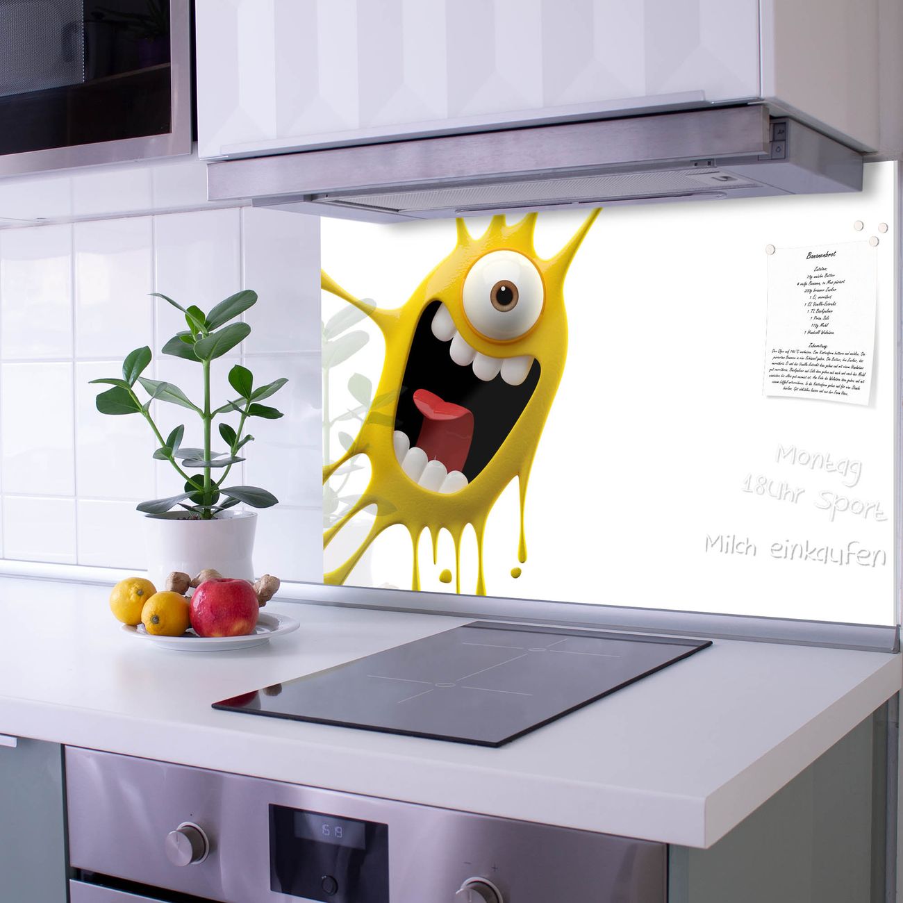 Die Küchenrückwand ist eine elegante Mehrzwecktafel: als Spritzschutz hinter Herd oder Waschbecken, hält Notizen wie ein Memoboard, ist beschreibbar mit Kreidestiften oder Whiteboard-Markern, sieht umwerfend als Glasbild aus. Sie besteht aus gehärtetem Glas, die Rückwand aus einem magnetischen Stahlblech. Durch die superflache Bauweise haben Sie die Wahl aus einer Vielzahl von Befestigungsmöglichkeiten. Sie können die Küchenrückwand mit einem Montagekleber superflach an die Wand kleben oder Sie wählen eines unserer passenden Befestigungssets, welches eine optimale Montage garantiert. Die Küchenrückwand besteht aus zertifiziertem Sicherheitsglas. Durch die mitgelieferten 4 Neodym-Magnete ist Ihre Glas Magnettafel sofort einsatzbereit.