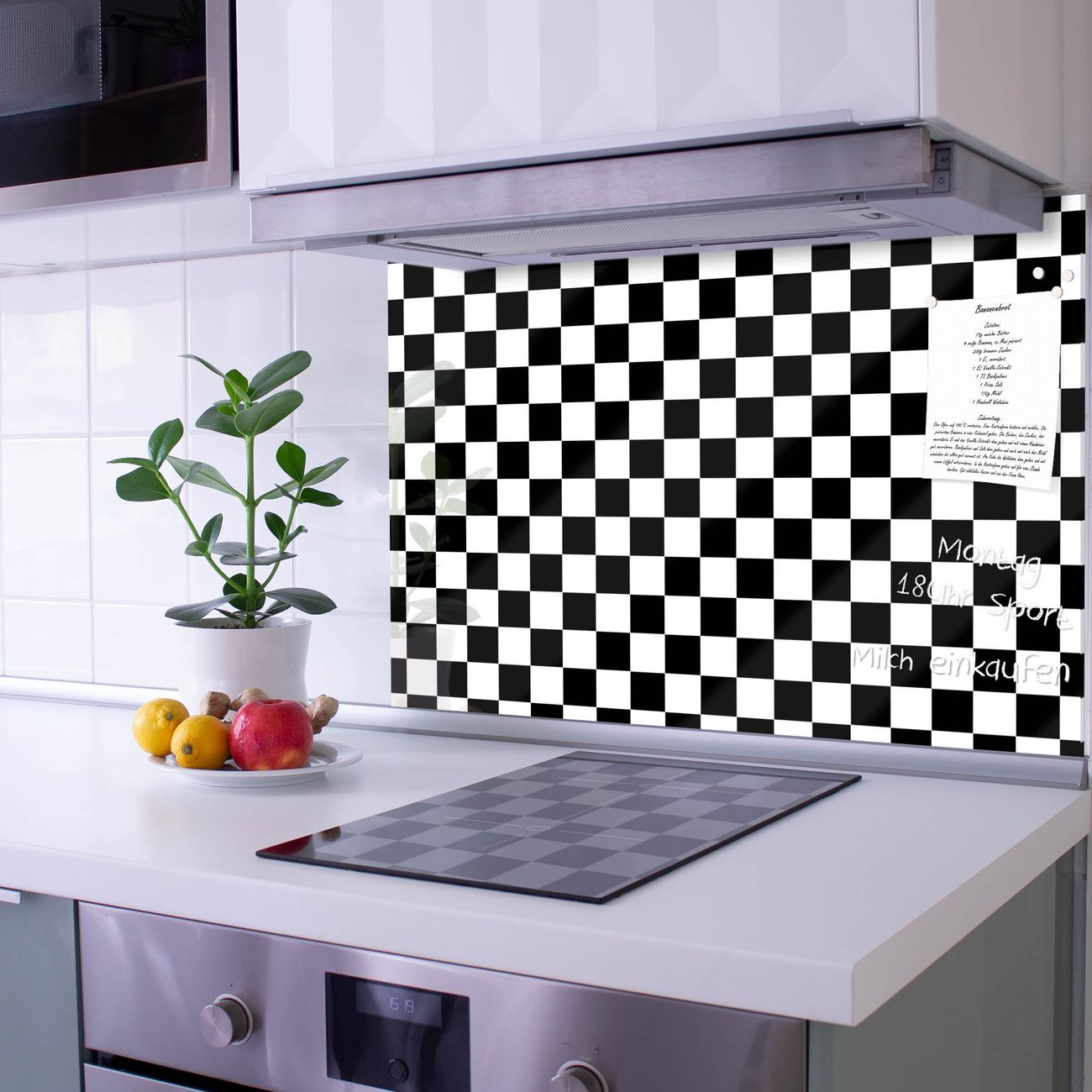 Die banjado Glas Küchenrückwand in verschiedenen Größen mit Motiv Karo Schwarz schützt Ihre Küchenfliesen vor Fettspritzern oder Wasserflecken. Der Spritzschutz ist gleichzeitig magnetisch und hält Ihre Rezepte oder Einkaufslisten. 4 Neodym-Magnete und 1 Kreidestift liegen bereits bei. Leuchtende Motive und hochwertiges Material machen den Spritzschutz zum Designobjekt. Das dekorative Glasbild gibt Ihrer Küche ein individuelles Erscheinungsbild. Abgerundete Kanten und Sicherheitsglas sorgen für einen sicheren Einsatz.