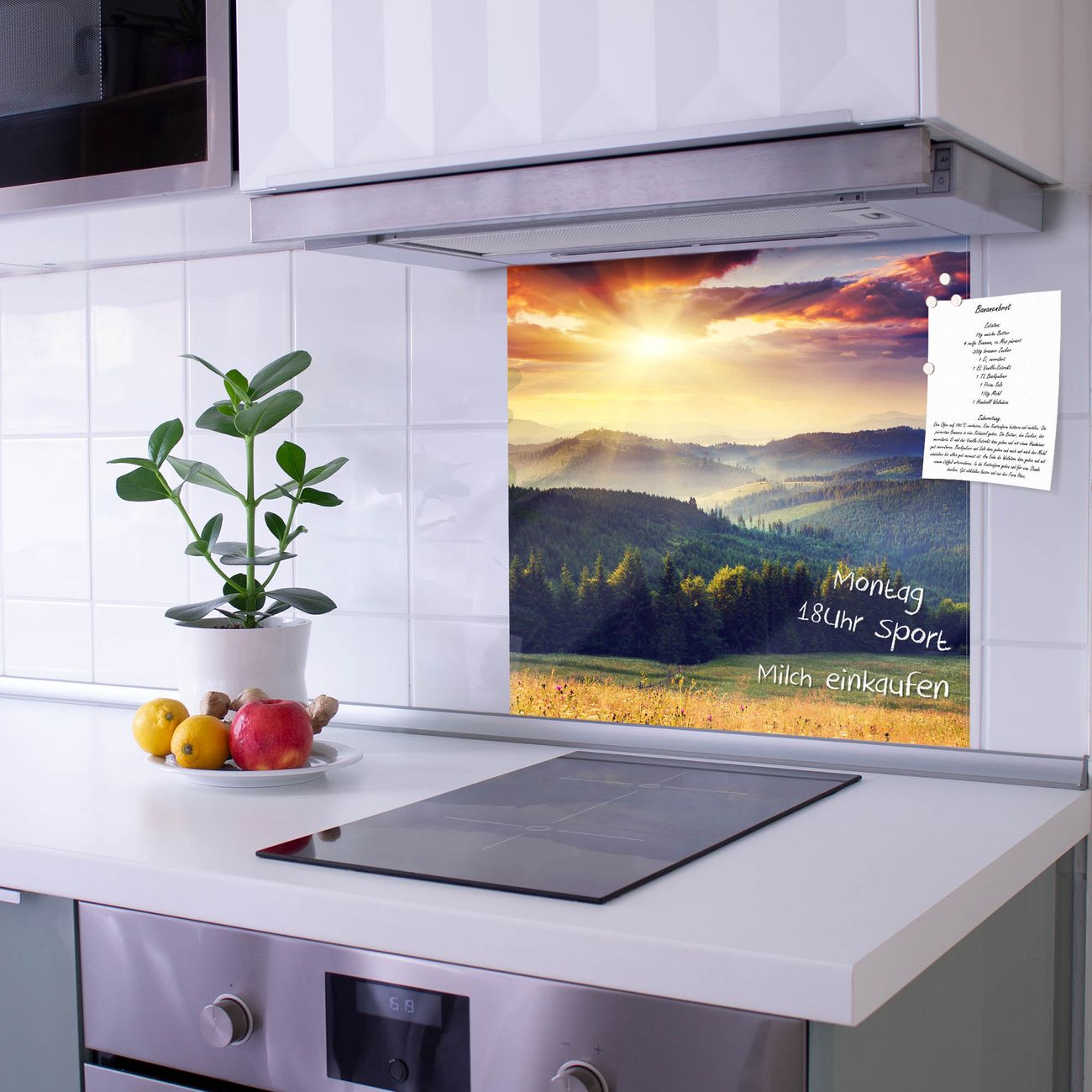 Die banjado Glas Küchenrückwand in verschiedenen Größen mit Motiv Karpaten Sonnenuntergang schützt Ihre Küchenfliesen vor Fettspritzern oder Wasserflecken. Der Spritzschutz ist gleichzeitig magnetisch und hält Ihre Rezepte oder Einkaufslisten. 4 Neodym-Magnete und 1 Kreidestift liegen bereits bei. Leuchtende Motive und hochwertiges Material machen den Spritzschutz zum Designobjekt. Das dekorative Glasbild gibt Ihrer Küche ein individuelles Erscheinungsbild. Abgerundete Kanten und Sicherheitsglas sorgen für einen sicheren Einsatz.