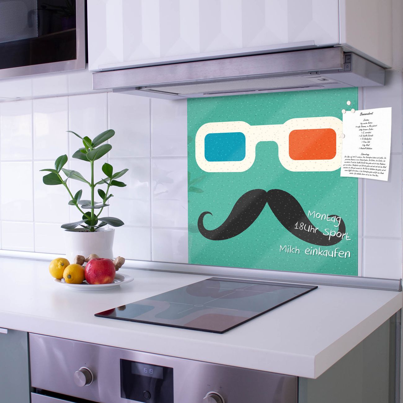 Die Küchenrückwand ist eine elegante Mehrzwecktafel: als Spritzschutz hinter Herd oder Waschbecken, hält Notizen wie ein Memoboard, ist beschreibbar mit Kreidestiften oder Whiteboard-Markern, sieht umwerfend als Glasbild aus. Sie besteht aus gehärtetem Glas, die Rückwand aus einem magnetischen Stahlblech. Durch die superflache Bauweise haben Sie die Wahl aus einer Vielzahl von Befestigungsmöglichkeiten. Sie können die Küchenrückwand mit einem Montagekleber superflach an die Wand kleben oder Sie wählen eines unserer passenden Befestigungssets, welches eine optimale Montage garantiert. Die Küchenrückwand besteht aus zertifiziertem Sicherheitsglas. Durch die mitgelieferten 4 Neodym-Magnete ist Ihre Glas Magnettafel sofort einsatzbereit.