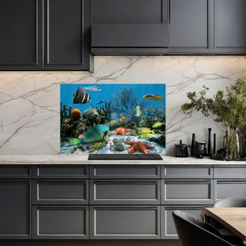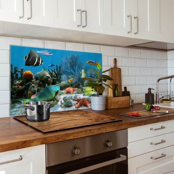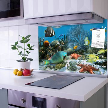 Die banjado Glas Küchenrückwand in verschiedenen Größen mit Motiv Korallenriff 1 schützt Ihre Küchenfliesen vor Fettspritzern oder Wasserflecken. Der Spritzschutz ist gleichzeitig magnetisch und hält Ihre Rezepte oder Einkaufslisten. 4 Neodym-Magnete und 1 Kreidestift liegen bereits bei. Leuchtende Motive und hochwertiges Material machen den Spritzschutz zum Designobjekt. Das dekorative Glasbild gibt Ihrer Küche ein individuelles Erscheinungsbild. Abgerundete Kanten und Sicherheitsglas sorgen für einen sicheren Einsatz.