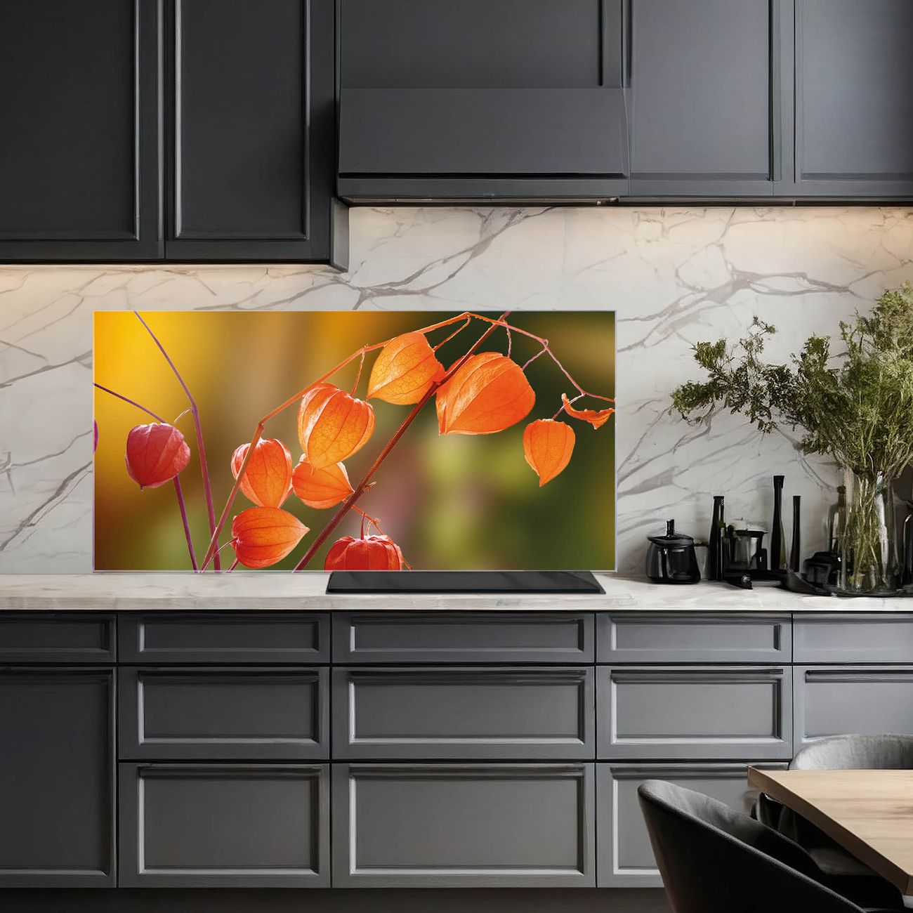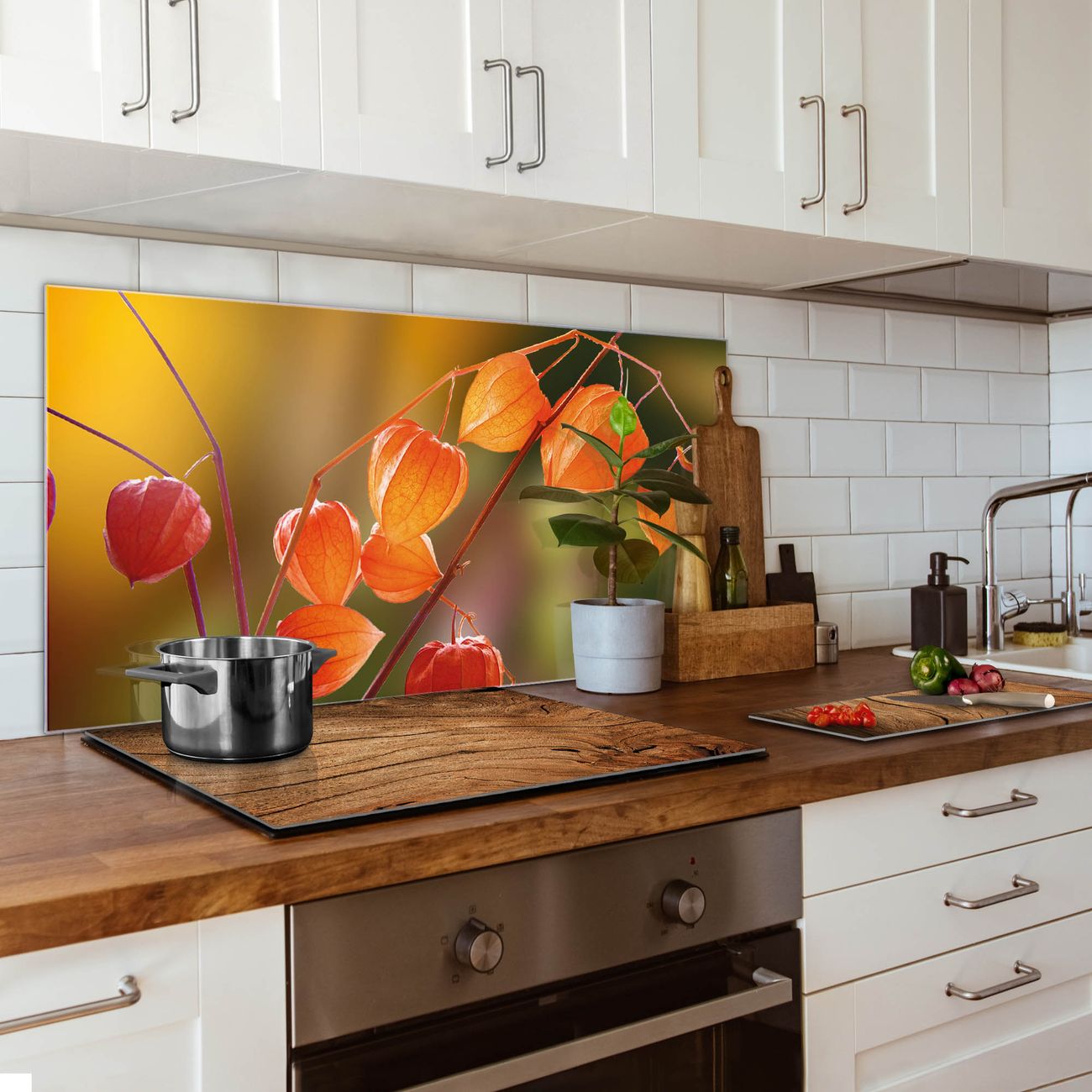 Die banjado Glas Küchenrückwand in verschiedenen Größen mit Motiv Lampionblume schützt Ihre Küchenfliesen vor Fettspritzern oder Wasserflecken. Der Spritzschutz ist gleichzeitig magnetisch und hält Ihre Rezepte oder Einkaufslisten. 4 Neodym-Magnete und 1 Kreidestift liegen bereits bei. Leuchtende Motive und hochwertiges Material machen den Spritzschutz zum Designobjekt. Das dekorative Glasbild gibt Ihrer Küche ein individuelles Erscheinungsbild. Abgerundete Kanten und Sicherheitsglas sorgen für einen sicheren Einsatz.