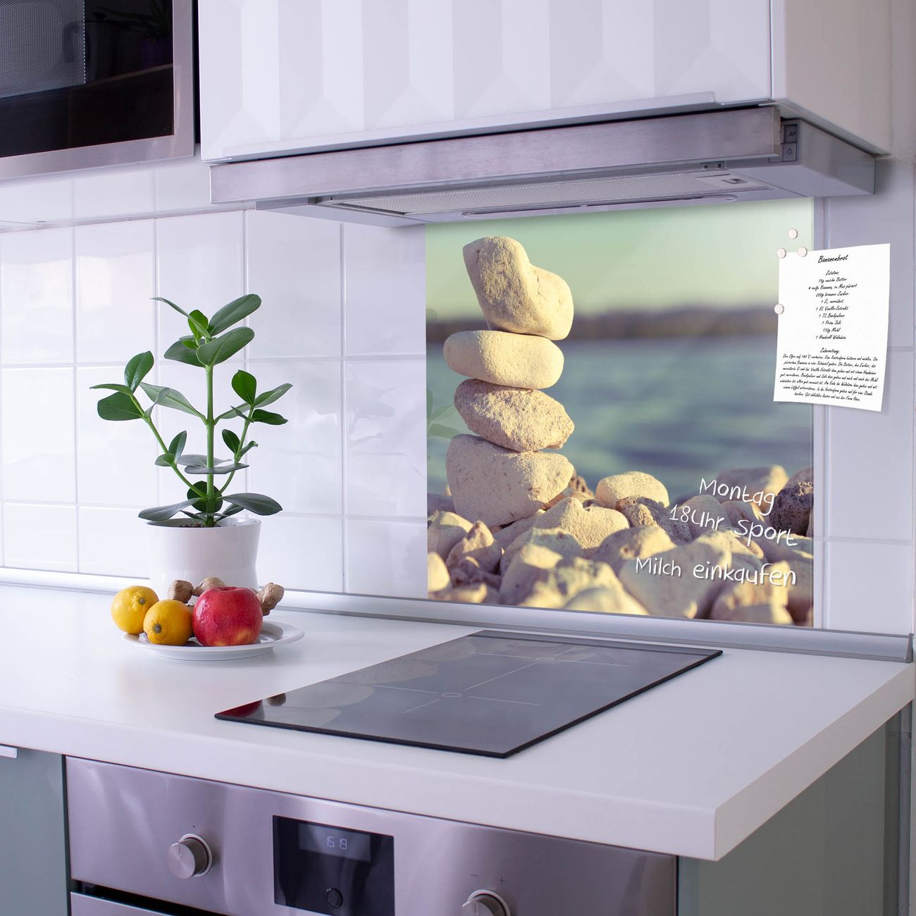 Die Küchenrückwand ist eine elegante Mehrzwecktafel: als Spritzschutz hinter Herd oder Waschbecken, hält Notizen wie ein Memoboard, ist beschreibbar mit Kreidestiften oder Whiteboard-Markern, sieht umwerfend als Glasbild aus. Sie besteht aus gehärtetem Glas, die Rückwand aus einem magnetischen Stahlblech. Durch die superflache Bauweise haben Sie die Wahl aus einer Vielzahl von Befestigungsmöglichkeiten. Sie können die Küchenrückwand mit einem Montagekleber superflach an die Wand kleben oder Sie wählen eines unserer passenden Befestigungssets, welches eine optimale Montage garantiert. Die Küchenrückwand besteht aus zertifiziertem Sicherheitsglas. Durch die mitgelieferten 4 Neodym-Magnete ist Ihre Glas Magnettafel sofort einsatzbereit.