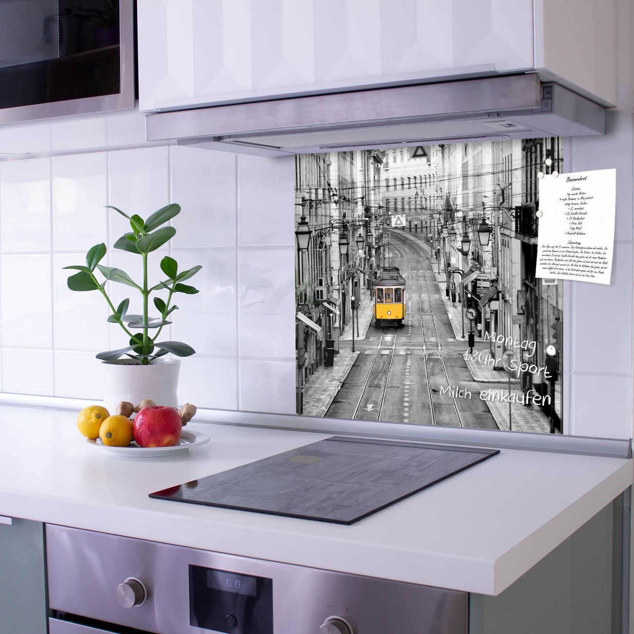 Die Küchenrückwand ist eine elegante Mehrzwecktafel: als Spritzschutz hinter Herd oder Waschbecken, hält Notizen wie ein Memoboard, ist beschreibbar mit Kreidestiften oder Whiteboard-Markern, sieht umwerfend als Glasbild aus. Sie besteht aus gehärtetem Glas, die Rückwand aus einem magnetischen Stahlblech. Durch die superflache Bauweise haben Sie die Wahl aus einer Vielzahl von Befestigungsmöglichkeiten. Sie können die Küchenrückwand mit einem Montagekleber superflach an die Wand kleben oder Sie wählen eines unserer passenden Befestigungssets, welches eine optimale Montage garantiert. Die Küchenrückwand besteht aus zertifiziertem Sicherheitsglas. Durch die mitgelieferten 4 Neodym-Magnete ist Ihre Glas Magnettafel sofort einsatzbereit.