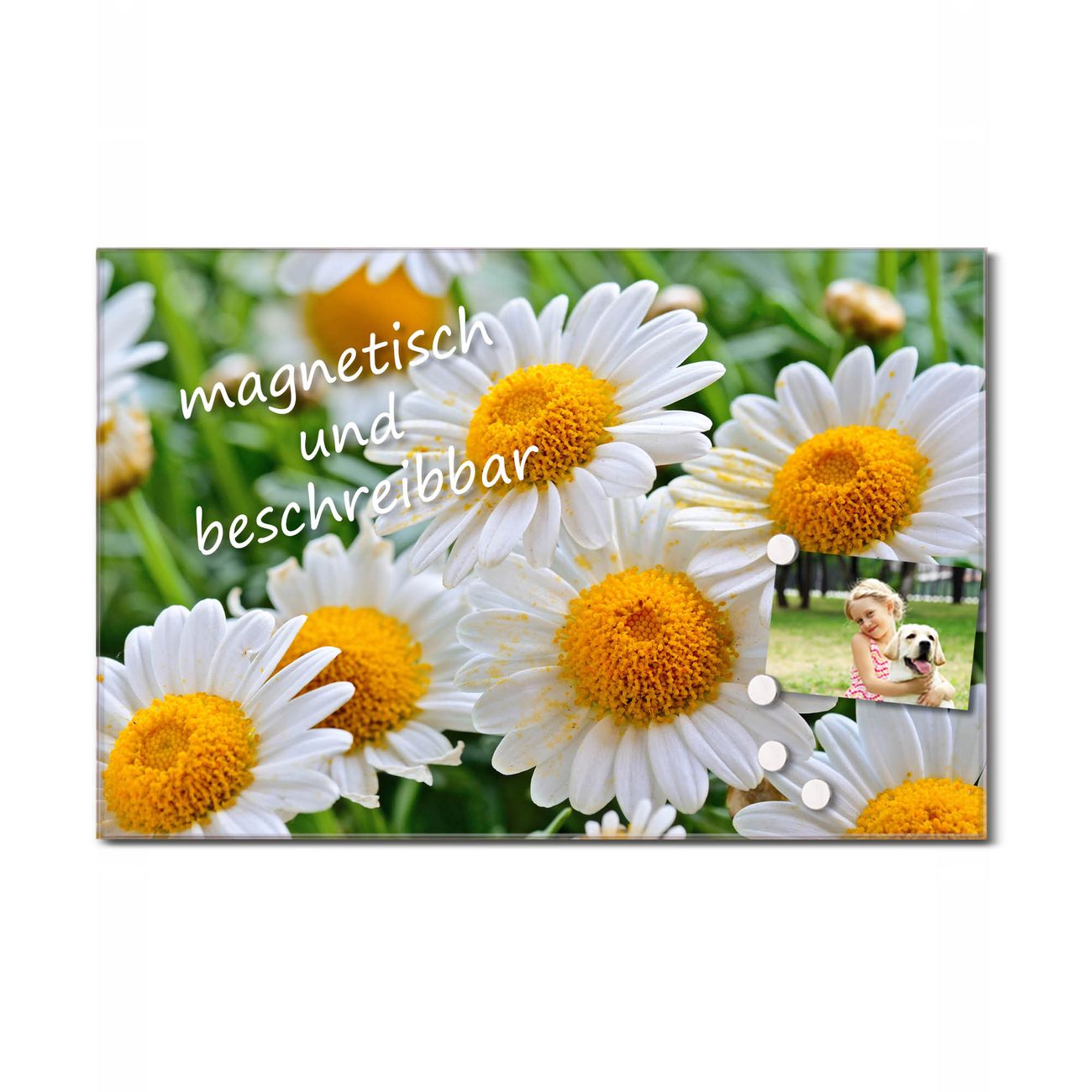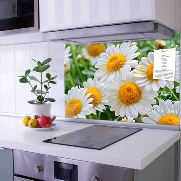 Die banjado Glas Küchenrückwand in verschiedenen Größen mit Motiv Margeriten Illustration schützt Ihre Küchenfliesen vor Fettspritzern oder Wasserflecken. Der Spritzschutz ist gleichzeitig magnetisch und hält Ihre Rezepte oder Einkaufslisten. 4 Neodym-Magnete und 1 Kreidestift liegen bereits bei. Leuchtende Motive und hochwertiges Material machen den Spritzschutz zum Designobjekt. Das dekorative Glasbild gibt Ihrer Küche ein individuelles Erscheinungsbild. Abgerundete Kanten und Sicherheitsglas sorgen für einen sicheren Einsatz.