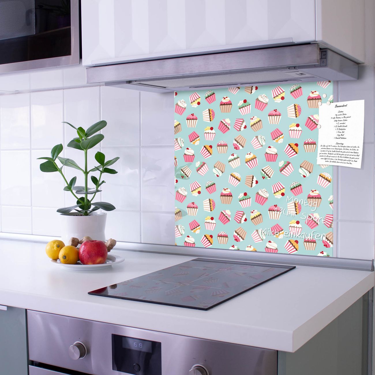 Die banjado Glas Küchenrückwand in verschiedenen Größen mit Motiv Muffins schützt Ihre Küchenfliesen vor Fettspritzern oder Wasserflecken. Der Spritzschutz ist gleichzeitig magnetisch und hält Ihre Rezepte oder Einkaufslisten. 4 Neodym-Magnete und 1 Kreidestift liegen bereits bei. Leuchtende Motive und hochwertiges Material machen den Spritzschutz zum Designobjekt. Das dekorative Glasbild gibt Ihrer Küche ein individuelles Erscheinungsbild. Abgerundete Kanten und Sicherheitsglas sorgen für einen sicheren Einsatz.