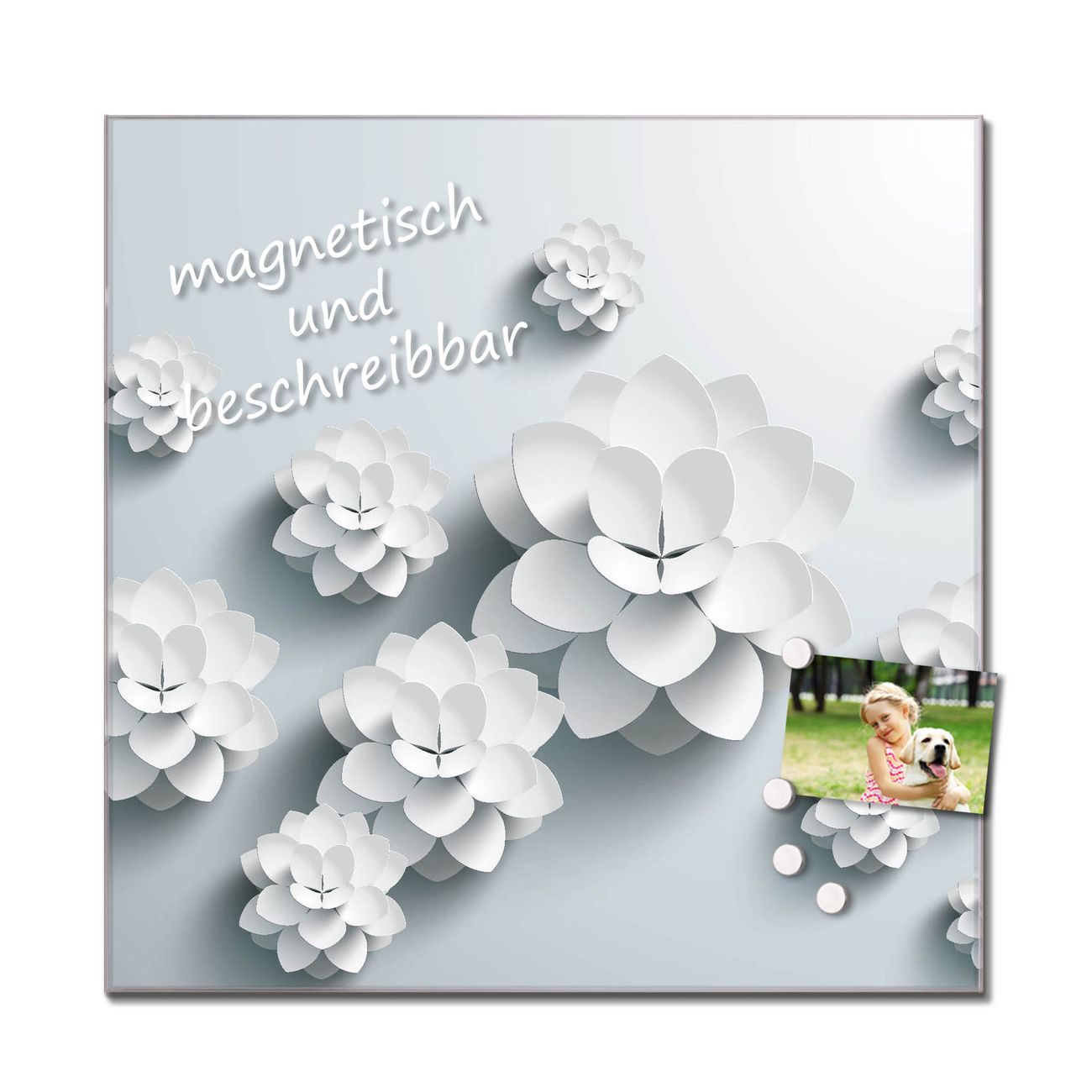 Bitte beachten Sie, dass ausschließlich spezielle Magnete an der Glastafel haften! Wir empfehlen banjado Neodym Magnete, diese sind durch uns auf Wirksamkeit geprüft.