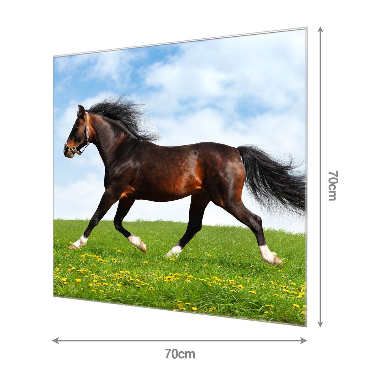 Material  4mm Sicherheitsglas mit Metallrückwand Eigenschaften  beschreibbar, magnetisch, kratzfest Maße  70x70x0,6cm, 7,4 kg schwer Motiv  Nummer 10021 Pferd Zubehör  inklusive 4 Neodym-Magnete