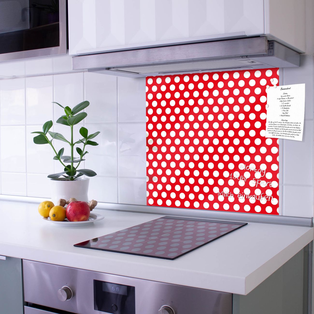 Die banjado Glas Küchenrückwand in verschiedenen Größen mit Motiv Punkte Rot schützt Ihre Küchenfliesen vor Fettspritzern oder Wasserflecken. Der Spritzschutz ist gleichzeitig magnetisch und hält Ihre Rezepte oder Einkaufslisten. 4 Neodym-Magnete und 1 Kreidestift liegen bereits bei. Leuchtende Motive und hochwertiges Material machen den Spritzschutz zum Designobjekt. Das dekorative Glasbild gibt Ihrer Küche ein individuelles Erscheinungsbild. Abgerundete Kanten und Sicherheitsglas sorgen für einen sicheren Einsatz.