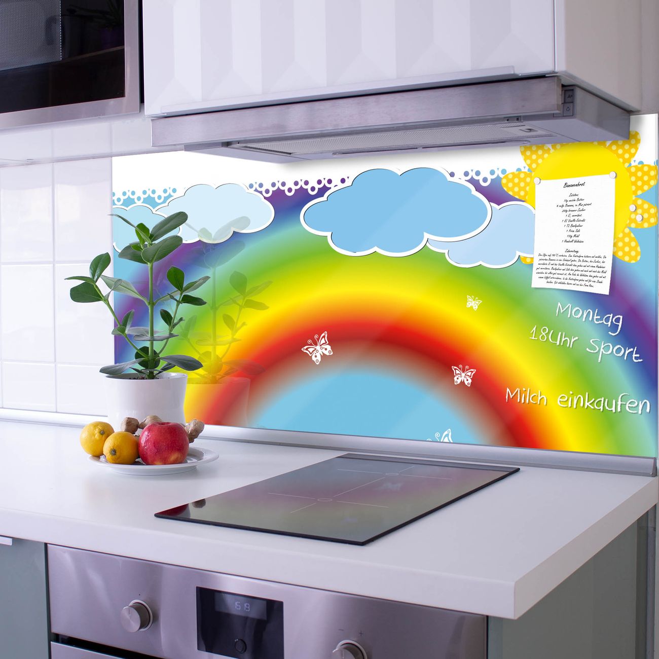 Die Küchenrückwand ist eine elegante Mehrzwecktafel: als Spritzschutz hinter Herd oder Waschbecken, hält Notizen wie ein Memoboard, ist beschreibbar mit Kreidestiften oder Whiteboard-Markern, sieht umwerfend als Glasbild aus. Sie besteht aus gehärtetem Glas, die Rückwand aus einem magnetischen Stahlblech. Durch die superflache Bauweise haben Sie die Wahl aus einer Vielzahl von Befestigungsmöglichkeiten. Sie können die Küchenrückwand mit einem Montagekleber superflach an die Wand kleben oder Sie wählen eines unserer passenden Befestigungssets, welches eine optimale Montage garantiert. Die Küchenrückwand besteht aus zertifiziertem Sicherheitsglas. Durch die mitgelieferten 4 Neodym-Magnete ist Ihre Glas Magnettafel sofort einsatzbereit.