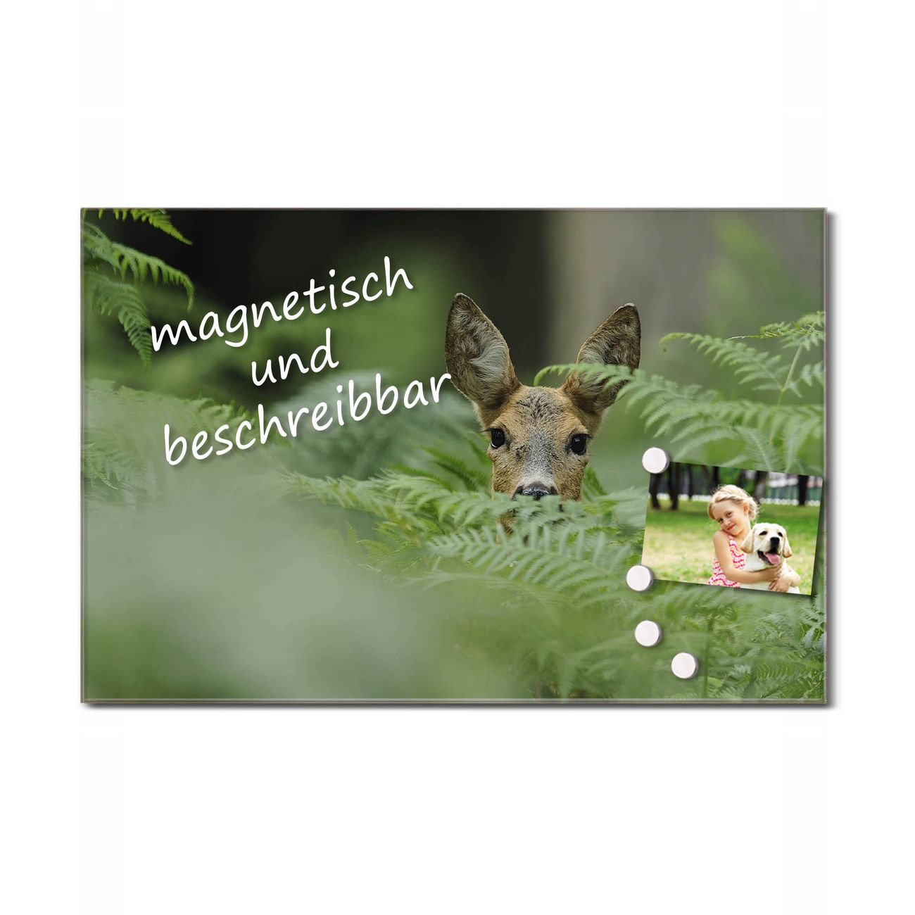 Die banjado Glas Küchenrückwand in verschiedenen Größen mit Motiv Reh schützt Ihre Küchenfliesen vor Fettspritzern oder Wasserflecken. Der Spritzschutz ist gleichzeitig magnetisch und hält Ihre Rezepte oder Einkaufslisten. 4 Neodym-Magnete und 1 Kreidestift liegen bereits bei. Leuchtende Motive und hochwertiges Material machen den Spritzschutz zum Designobjekt. Das dekorative Glasbild gibt Ihrer Küche ein individuelles Erscheinungsbild. Abgerundete Kanten und Sicherheitsglas sorgen für einen sicheren Einsatz.
