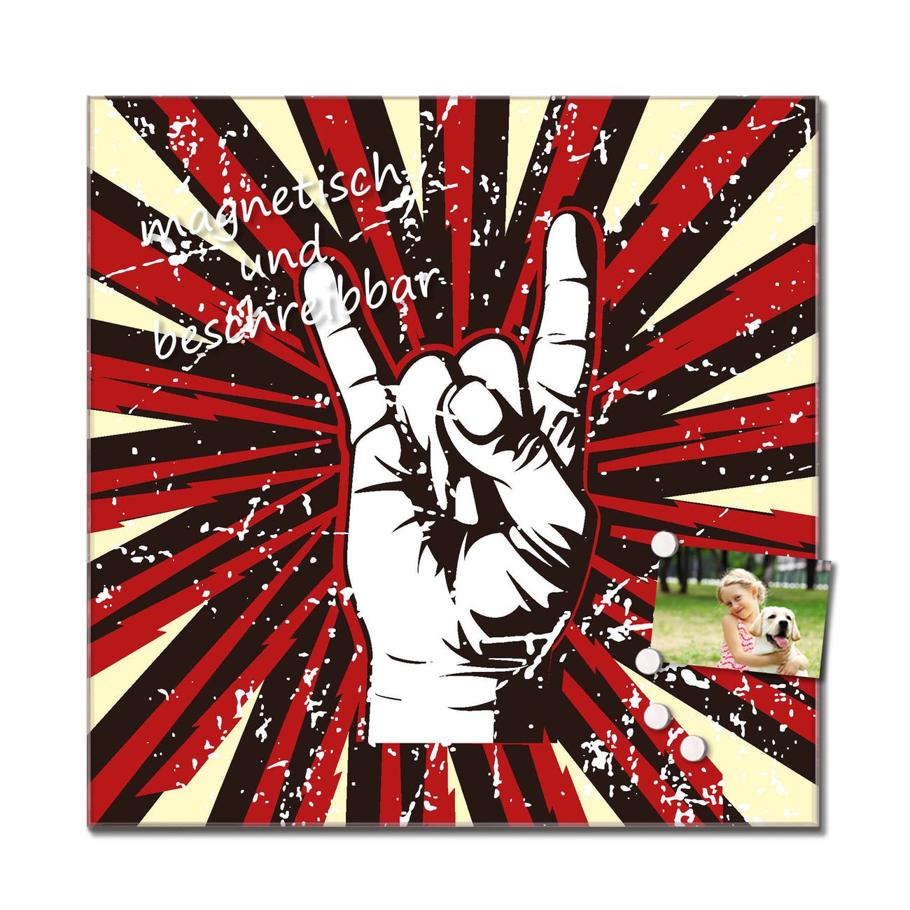 Die banjado Glas Küchenrückwand in verschiedenen Größen mit Motiv Rock On schützt Ihre Küchenfliesen vor Fettspritzern oder Wasserflecken. Der Spritzschutz ist gleichzeitig magnetisch und hält Ihre Rezepte oder Einkaufslisten. 4 Neodym-Magnete und 1 Kreidestift liegen bereits bei. Leuchtende Motive und hochwertiges Material machen den Spritzschutz zum Designobjekt. Das dekorative Glasbild gibt Ihrer Küche ein individuelles Erscheinungsbild. Abgerundete Kanten und Sicherheitsglas sorgen für einen sicheren Einsatz.