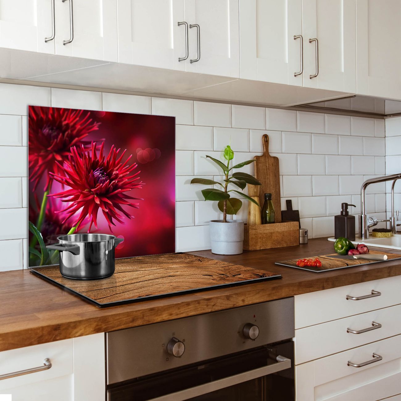 Die banjado Glas Küchenrückwand in verschiedenen Größen mit Motiv Rote Dahlien schützt Ihre Küchenfliesen vor Fettspritzern oder Wasserflecken. Der Spritzschutz ist gleichzeitig magnetisch und hält Ihre Rezepte oder Einkaufslisten. 4 Neodym-Magnete und 1 Kreidestift liegen bereits bei. Leuchtende Motive und hochwertiges Material machen den Spritzschutz zum Designobjekt. Das dekorative Glasbild gibt Ihrer Küche ein individuelles Erscheinungsbild. Abgerundete Kanten und Sicherheitsglas sorgen für einen sicheren Einsatz.