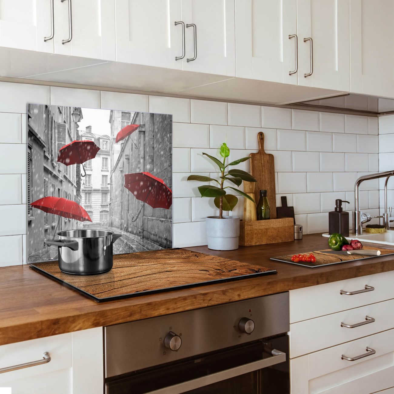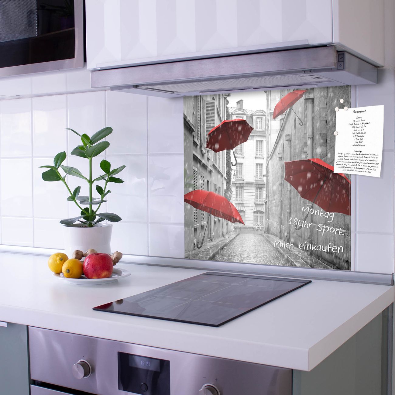 Die banjado Glas Küchenrückwand in verschiedenen Größen mit Motiv Rote Schirme schützt Ihre Küchenfliesen vor Fettspritzern oder Wasserflecken. Der Spritzschutz ist gleichzeitig magnetisch und hält Ihre Rezepte oder Einkaufslisten. 4 Neodym-Magnete und 1 Kreidestift liegen bereits bei. Leuchtende Motive und hochwertiges Material machen den Spritzschutz zum Designobjekt. Das dekorative Glasbild gibt Ihrer Küche ein individuelles Erscheinungsbild. Abgerundete Kanten und Sicherheitsglas sorgen für einen sicheren Einsatz.