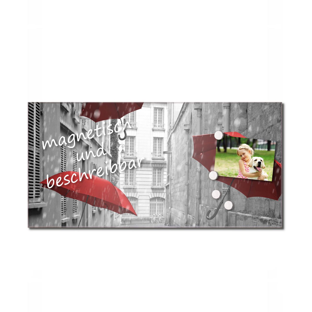 Die banjado Glas Küchenrückwand in verschiedenen Größen mit Motiv Rote Schirme schützt Ihre Küchenfliesen vor Fettspritzern oder Wasserflecken. Der Spritzschutz ist gleichzeitig magnetisch und hält Ihre Rezepte oder Einkaufslisten. 4 Neodym-Magnete und 1 Kreidestift liegen bereits bei. Leuchtende Motive und hochwertiges Material machen den Spritzschutz zum Designobjekt. Das dekorative Glasbild gibt Ihrer Küche ein individuelles Erscheinungsbild. Abgerundete Kanten und Sicherheitsglas sorgen für einen sicheren Einsatz.