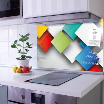 Die banjado Glas Küchenrückwand in verschiedenen Größen mit Motiv Schwebende Quadrate schützt Ihre Küchenfliesen vor Fettspritzern oder Wasserflecken. Der Spritzschutz ist gleichzeitig magnetisch und hält Ihre Rezepte oder Einkaufslisten. 4 Neodym-Magnete und 1 Kreidestift liegen bereits bei. Leuchtende Motive und hochwertiges Material machen den Spritzschutz zum Designobjekt. Das dekorative Glasbild gibt Ihrer Küche ein individuelles Erscheinungsbild. Abgerundete Kanten und Sicherheitsglas sorgen für einen sicheren Einsatz.