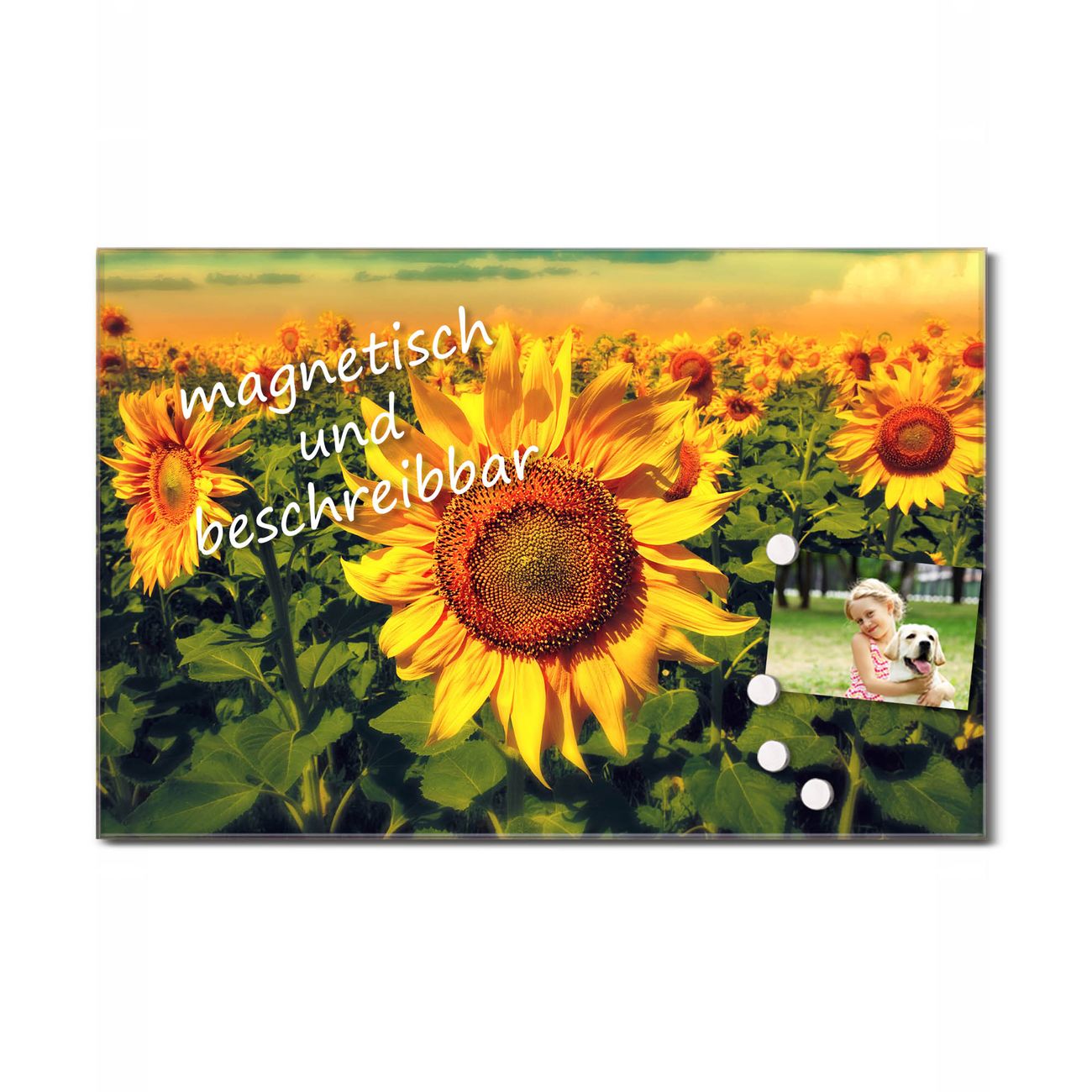 Die banjado Glas Küchenrückwand in verschiedenen Größen mit Motiv Sonnenblumen schützt Ihre Küchenfliesen vor Fettspritzern oder Wasserflecken. Der Spritzschutz ist gleichzeitig magnetisch und hält Ihre Rezepte oder Einkaufslisten. 4 Neodym-Magnete und 1 Kreidestift liegen bereits bei. Leuchtende Motive und hochwertiges Material machen den Spritzschutz zum Designobjekt. Das dekorative Glasbild gibt Ihrer Küche ein individuelles Erscheinungsbild. Abgerundete Kanten und Sicherheitsglas sorgen für einen sicheren Einsatz.