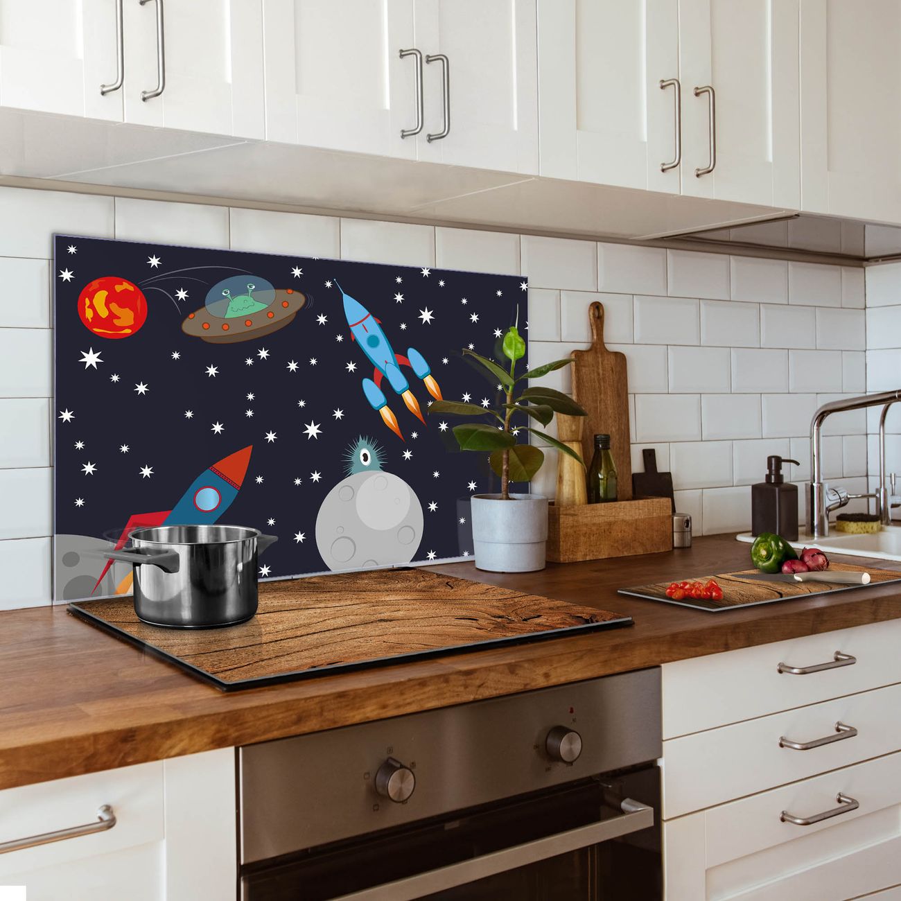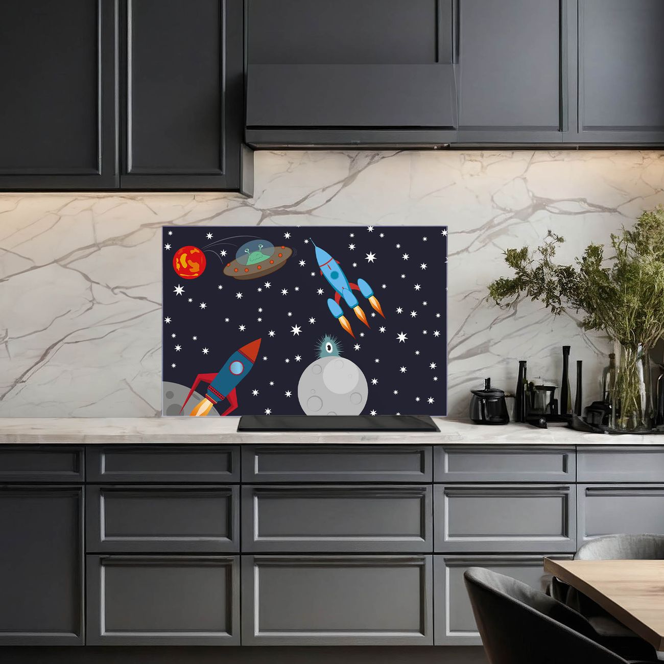 Die banjado Glas Küchenrückwand in verschiedenen Größen mit Motiv Space Traffic schützt Ihre Küchenfliesen vor Fettspritzern oder Wasserflecken. Der Spritzschutz ist gleichzeitig magnetisch und hält Ihre Rezepte oder Einkaufslisten. 4 Neodym-Magnete und 1 Kreidestift liegen bereits bei. Leuchtende Motive und hochwertiges Material machen den Spritzschutz zum Designobjekt. Das dekorative Glasbild gibt Ihrer Küche ein individuelles Erscheinungsbild. Abgerundete Kanten und Sicherheitsglas sorgen für einen sicheren Einsatz.