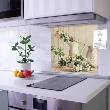 Die banjado Glas Küchenrückwand in verschiedenen Größen mit Motiv Stillleben Kirschblüten schützt Ihre Küchenfliesen vor Fettspritzern oder Wasserflecken. Der Spritzschutz ist gleichzeitig magnetisch und hält Ihre Rezepte oder Einkaufslisten. 4 Neodym-Magnete und 1 Kreidestift liegen bereits bei. Leuchtende Motive und hochwertiges Material machen den Spritzschutz zum Designobjekt. Das dekorative Glasbild gibt Ihrer Küche ein individuelles Erscheinungsbild. Abgerundete Kanten und Sicherheitsglas sorgen für einen sicheren Einsatz.