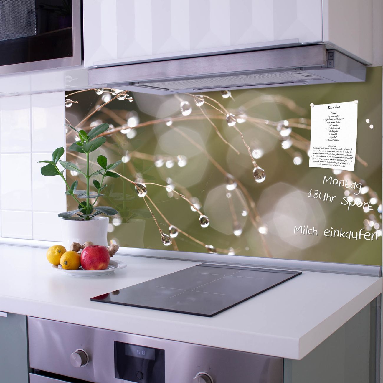 Die banjado Glas Küchenrückwand in verschiedenen Größen mit Motiv Tau Auf Zweigen schützt Ihre Küchenfliesen vor Fettspritzern oder Wasserflecken. Der Spritzschutz ist gleichzeitig magnetisch und hält Ihre Rezepte oder Einkaufslisten. 4 Neodym-Magnete und 1 Kreidestift liegen bereits bei. Leuchtende Motive und hochwertiges Material machen den Spritzschutz zum Designobjekt. Das dekorative Glasbild gibt Ihrer Küche ein individuelles Erscheinungsbild. Abgerundete Kanten und Sicherheitsglas sorgen für einen sicheren Einsatz.