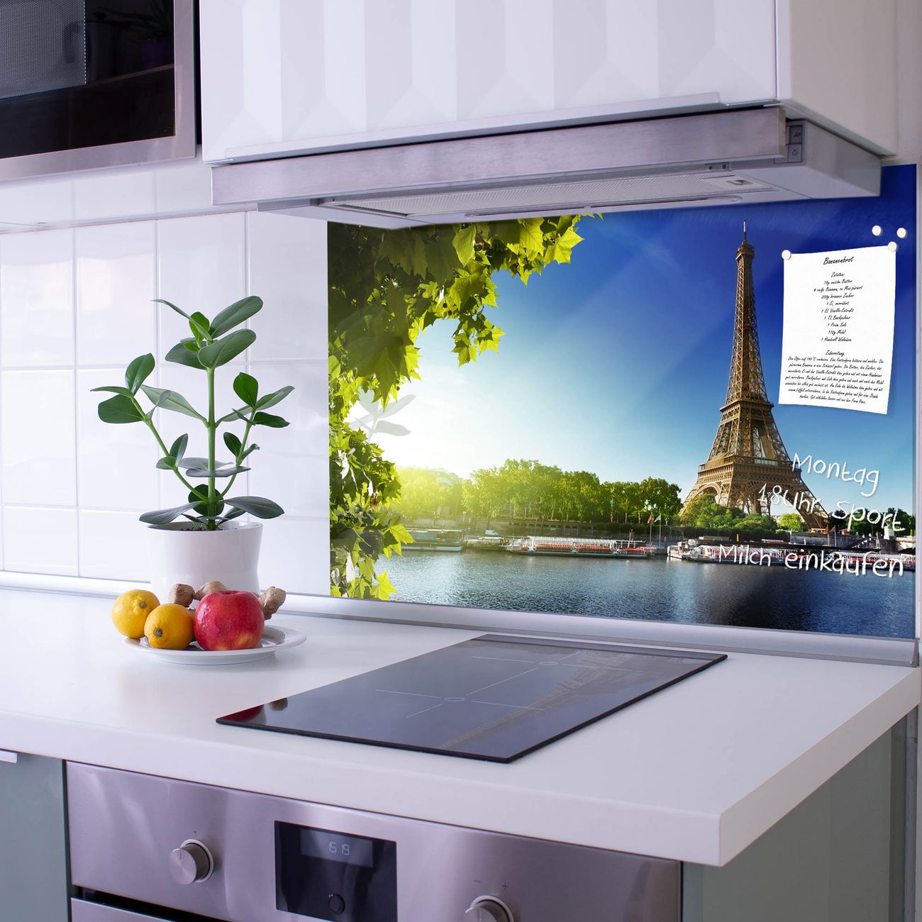 Die Küchenrückwand ist eine elegante Mehrzwecktafel: als Spritzschutz hinter Herd oder Waschbecken, hält Notizen wie ein Memoboard, ist beschreibbar mit Kreidestiften oder Whiteboard-Markern, sieht umwerfend als Glasbild aus. Sie besteht aus gehärtetem Glas, die Rückwand aus einem magnetischen Stahlblech. Durch die superflache Bauweise haben Sie die Wahl aus einer Vielzahl von Befestigungsmöglichkeiten. Sie können die Küchenrückwand mit einem Montagekleber superflach an die Wand kleben oder Sie wählen eines unserer passenden Befestigungssets, welches eine optimale Montage garantiert. Die Küchenrückwand besteht aus zertifiziertem Sicherheitsglas. Durch die mitgelieferten 4 Neodym-Magnete ist Ihre Glas Magnettafel sofort einsatzbereit.