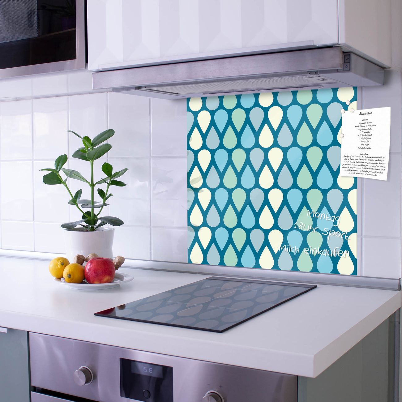 Die Küchenrückwand ist eine elegante Mehrzwecktafel: als Spritzschutz hinter Herd oder Waschbecken, hält Notizen wie ein Memoboard, ist beschreibbar mit Kreidestiften oder Whiteboard-Markern, sieht umwerfend als Glasbild aus. Sie besteht aus gehärtetem Glas, die Rückwand aus einem magnetischen Stahlblech. Durch die superflache Bauweise haben Sie die Wahl aus einer Vielzahl von Befestigungsmöglichkeiten. Sie können die Küchenrückwand mit einem Montagekleber superflach an die Wand kleben oder Sie wählen eines unserer passenden Befestigungssets, welches eine optimale Montage garantiert. Die Küchenrückwand besteht aus zertifiziertem Sicherheitsglas. Durch die mitgelieferten 4 Neodym-Magnete ist Ihre Glas Magnettafel sofort einsatzbereit.
