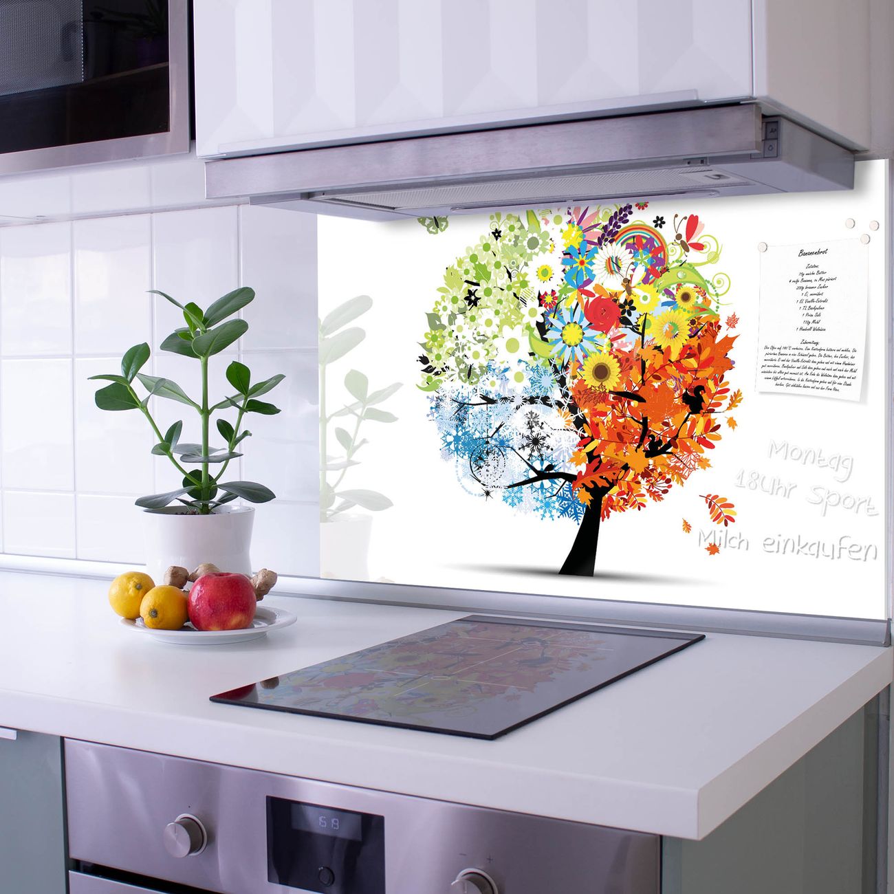Die banjado Glas Küchenrückwand in verschiedenen Größen mit Motiv Vier Jahreszeiten schützt Ihre Küchenfliesen vor Fettspritzern oder Wasserflecken. Der Spritzschutz ist gleichzeitig magnetisch und hält Ihre Rezepte oder Einkaufslisten. 4 Neodym-Magnete und 1 Kreidestift liegen bereits bei. Leuchtende Motive und hochwertiges Material machen den Spritzschutz zum Designobjekt. Das dekorative Glasbild gibt Ihrer Küche ein individuelles Erscheinungsbild. Abgerundete Kanten und Sicherheitsglas sorgen für einen sicheren Einsatz.