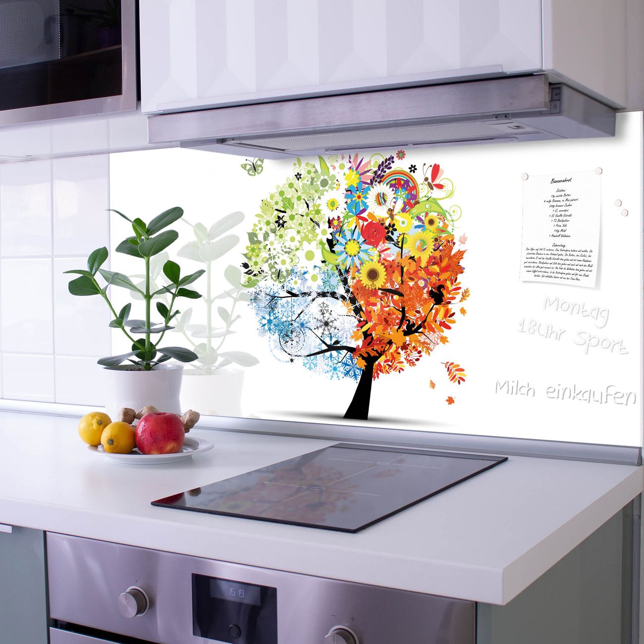 Die banjado Glas Küchenrückwand in verschiedenen Größen mit Motiv Vier Jahreszeiten schützt Ihre Küchenfliesen vor Fettspritzern oder Wasserflecken. Der Spritzschutz ist gleichzeitig magnetisch und hält Ihre Rezepte oder Einkaufslisten. 4 Neodym-Magnete und 1 Kreidestift liegen bereits bei. Leuchtende Motive und hochwertiges Material machen den Spritzschutz zum Designobjekt. Das dekorative Glasbild gibt Ihrer Küche ein individuelles Erscheinungsbild. Abgerundete Kanten und Sicherheitsglas sorgen für einen sicheren Einsatz.